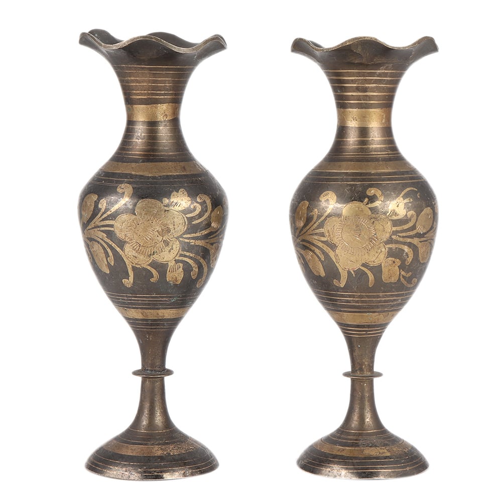 Black Etched Brass Etched Flower Design Vase In Pair