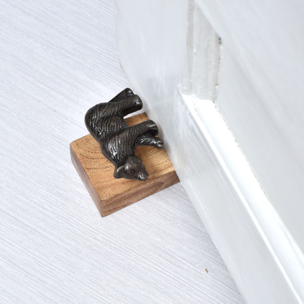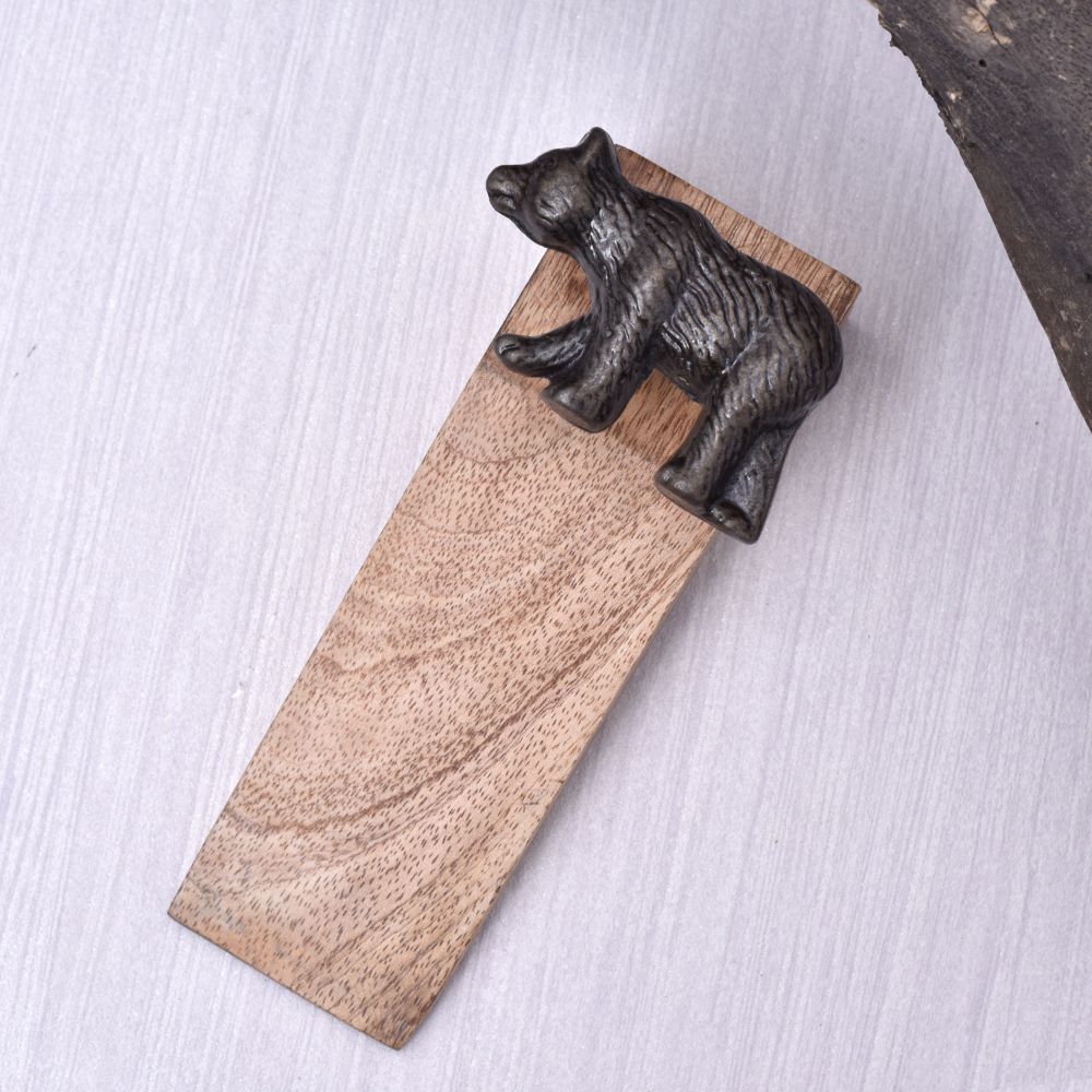 Buy a wooden door stopper online from our website which is a perfect blend of elegance and functionality. Handcrafted with precision by highly skilled and experienced Indian artisans, this high-quality wood door stopper boasts an antique brown finish that exudes timeless charm. A striking black-finished iron bear, expertly attached to the wood, adds a touch of rustic allure to its design. Functionality meets durability with a thoughtful rubber grip placed underneath, ensuring a firm hold on any surface, preventing slips and offering reliable door securing. Versatility is its forte, making it an ideal choice for various settings, be it at home, office, restaurant, hotel, cafe, or shop. Embrace the warmth of thoughtfulness by gifting this door stopper to your loved ones on special occasions, such as housewarmings or any celebratory event.