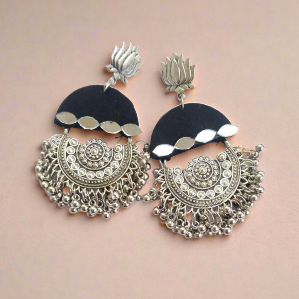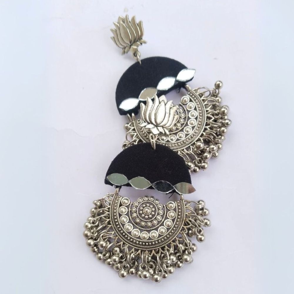 These Black Heavy Oxidized Jhumka Earrings blend the sophistication of deep black fabric with the artistry of oxidized silver detailing. Designed in a timeless jhumka silhouette, they offer a striking contrast that elevates both everyday ethnic wear and festive outfits. Lightweight yet statement-worthy, this pair brings a modern edge to traditional handcrafted jewelry.