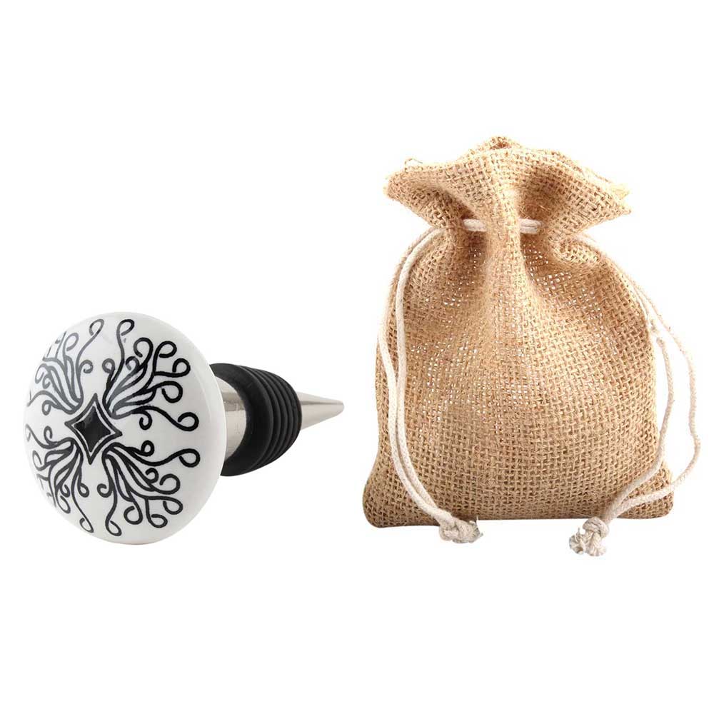 Black Leaf Flat Ceramic Wine Bottle Stopper. Zinc Alloy Wine Bottle Stopper with Attractive Jute Bag Packaging.