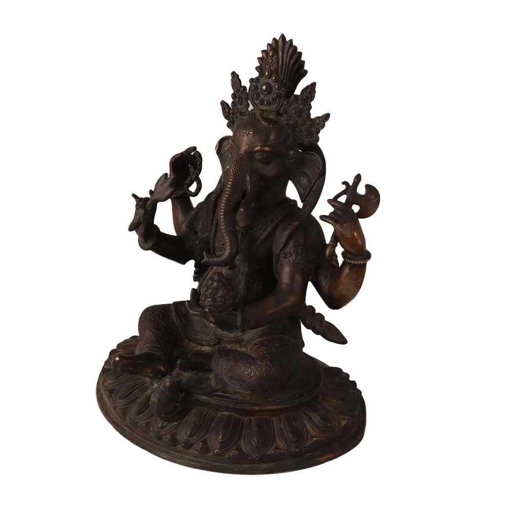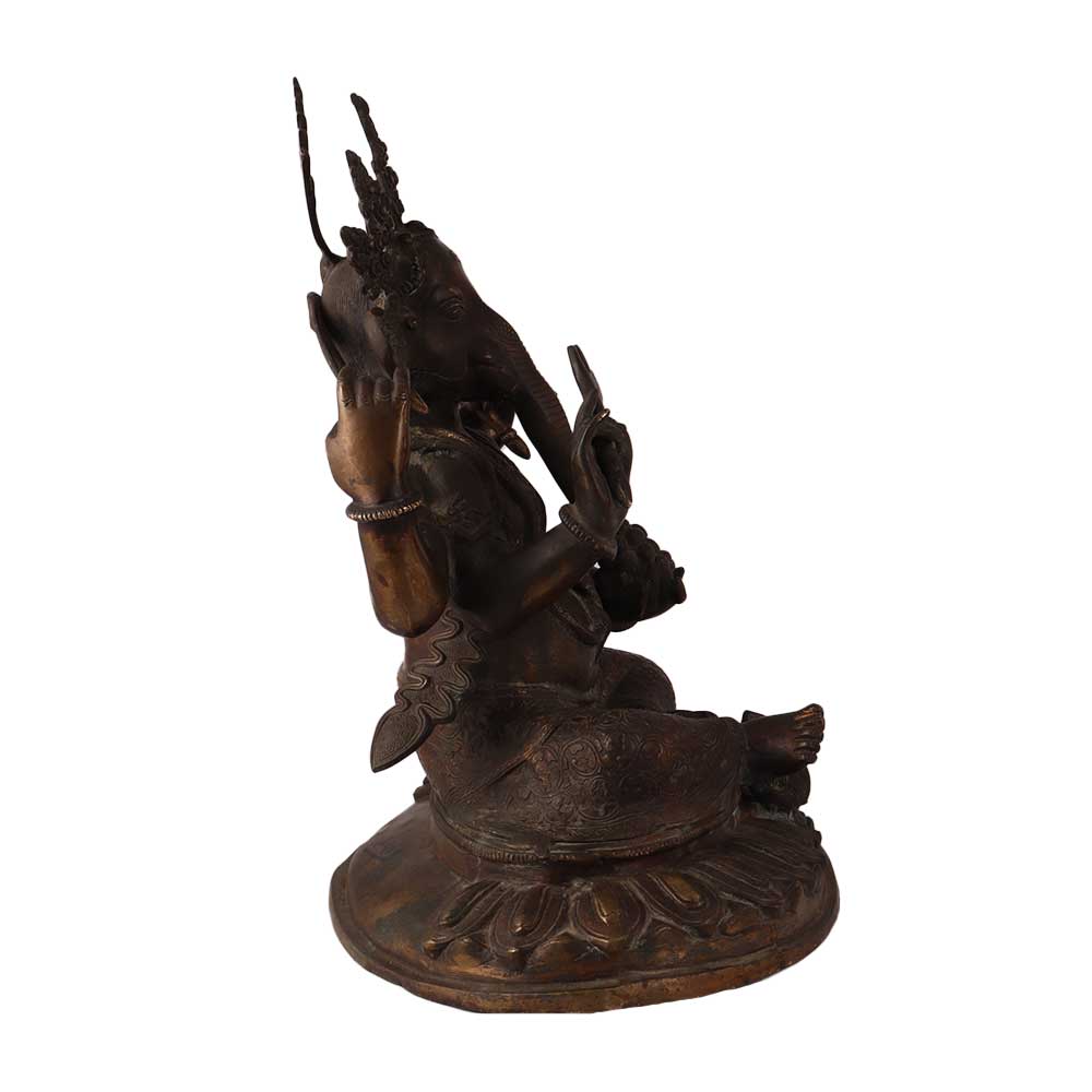 Ganesha, also known as Ganesh or Ganapati Tantra, is a Hindu deity with an elephant head statue decor be it traditional or modern. He is the patron saint of travelers and the god of wisdom, knowledge, and obstacles. Mashika is a mouse or rat who serves as his vahana, or vehicle. Hindus offer Ganesha prayers before beginning new endeavors, such as a new job or a move. This lord Ganesha statue design is the child of the Hindu deities Shiva and Parvati, who collectively represent the oneness of all in Hindu cosmology. Shiva and Parvati are represented here as the energetic material's subjective conscious. This statue is made of refined bronze and has lovely bronze patina and great detail. This god’s statue of Lord Ganesha in brass is great for worship as well as gifting.