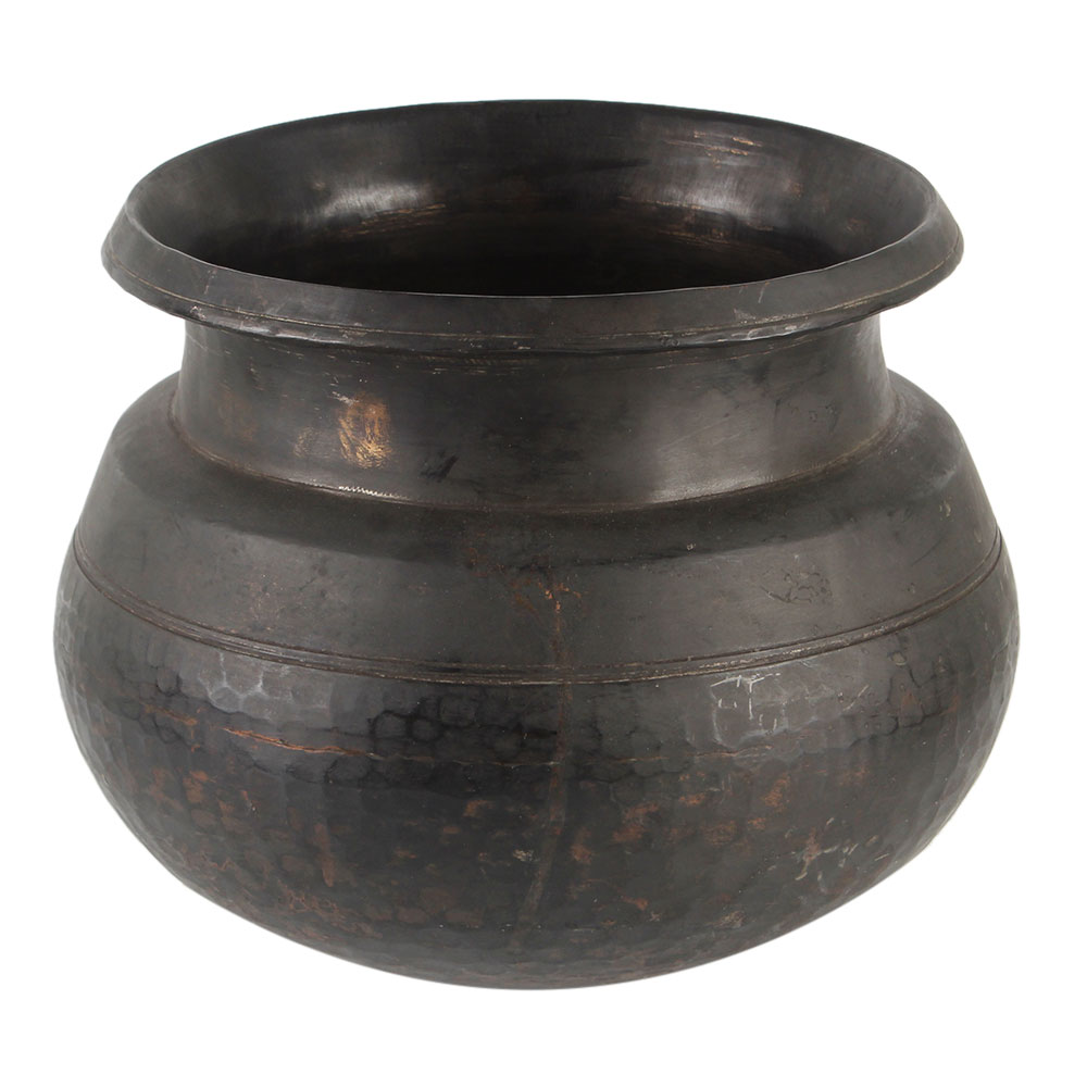 A large brass Indian Hindu Lota (also known as Chambu lota, Puja lota, or Lota Kalash) from the nineteenth century was used to store Holy Ganga water, bathe in Holy Ganga water, or perform Hindu rituals. The Lota does not sit flat and swivels due to its sloping bottom. The temple idle home ornament can also be used as a flower pot as a gift for relatives and friends.