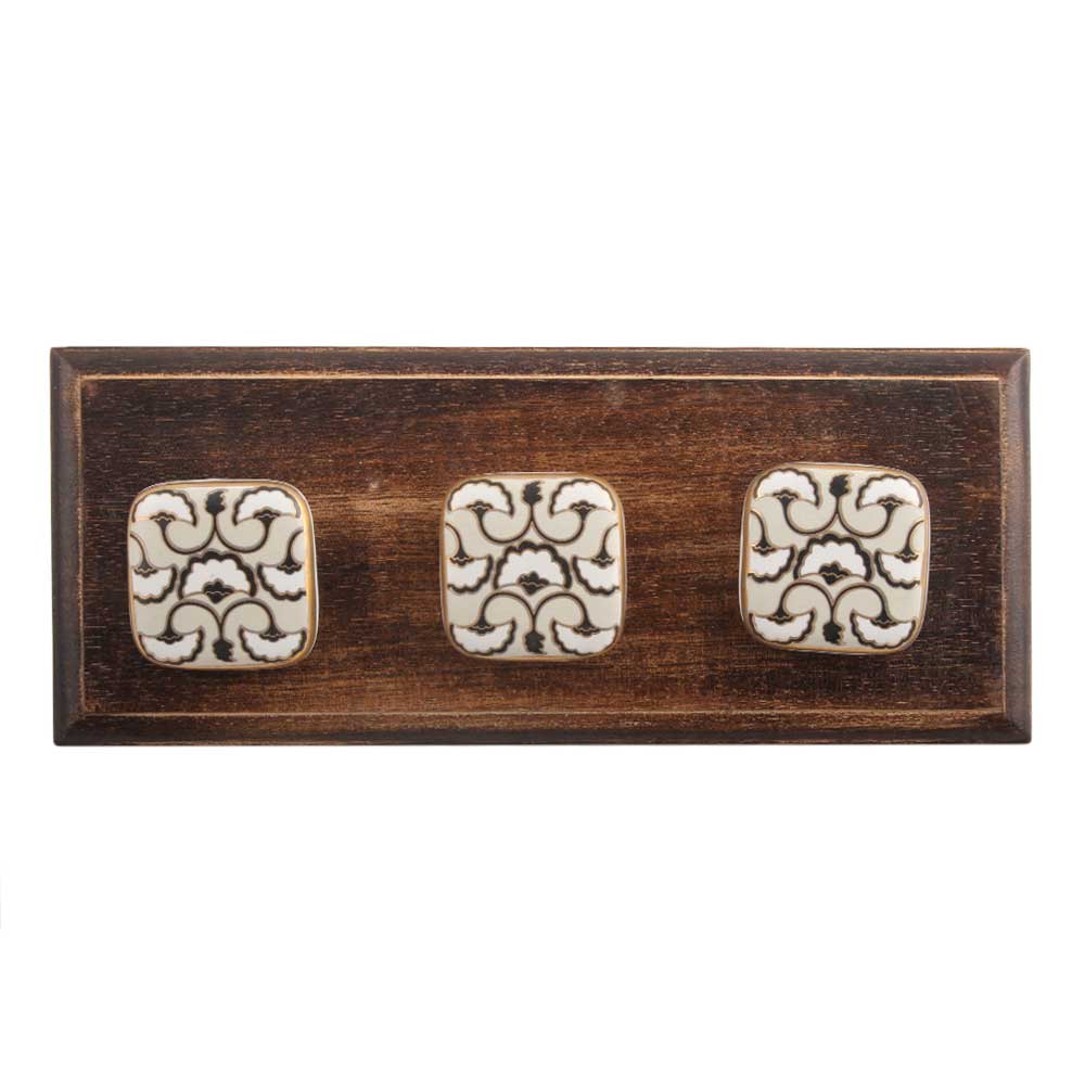Black Sea Shell Square Ceramic Wooden Hook. A Perfect Complement to the Soft Tone of the Wood are these White Traditional Hat & Coat Hook Made of Genuine Porcelain and Brass. It can be use to Hang Jewellery, Leashes, Towels, Scarves, Light Weight Sweaters, Caps Etc.