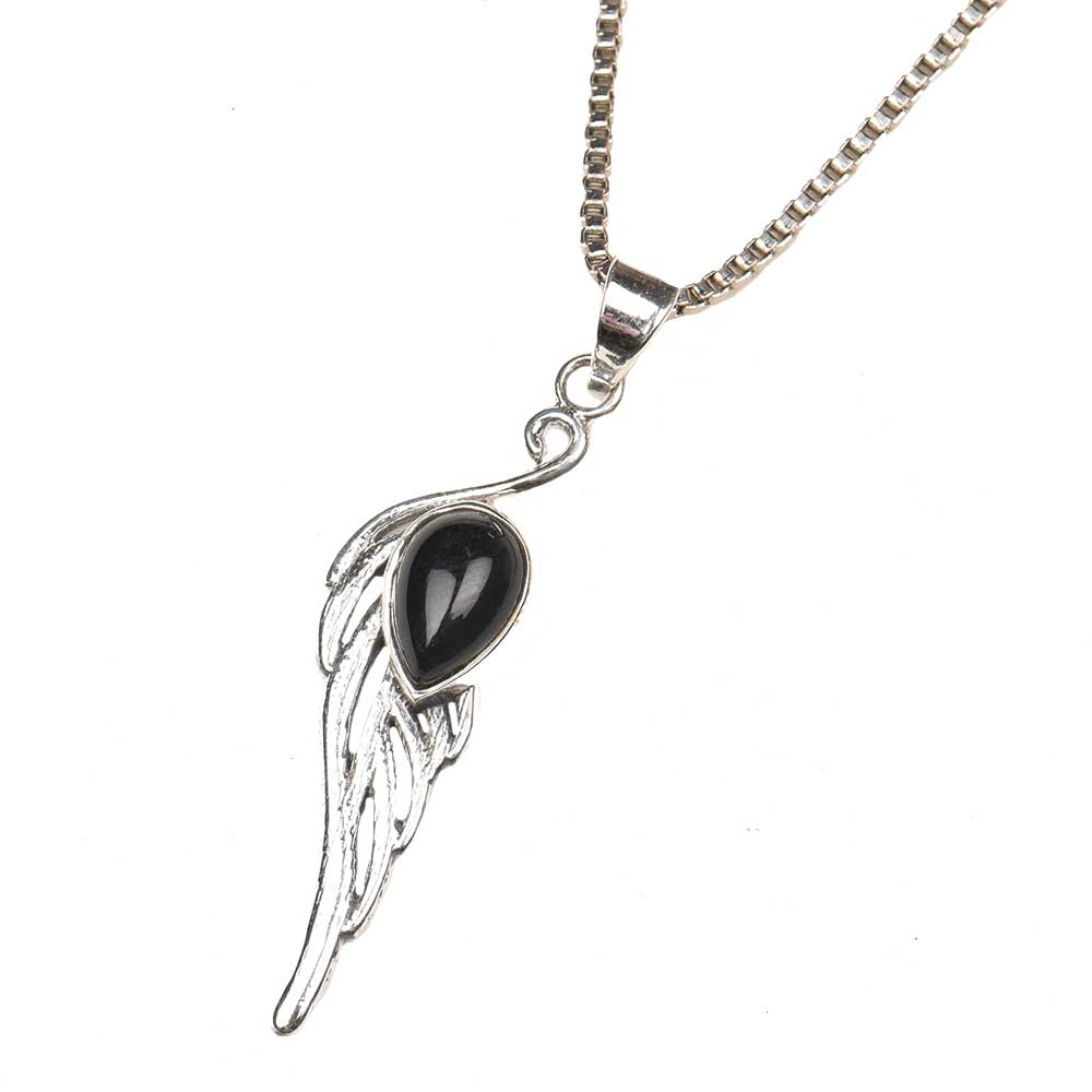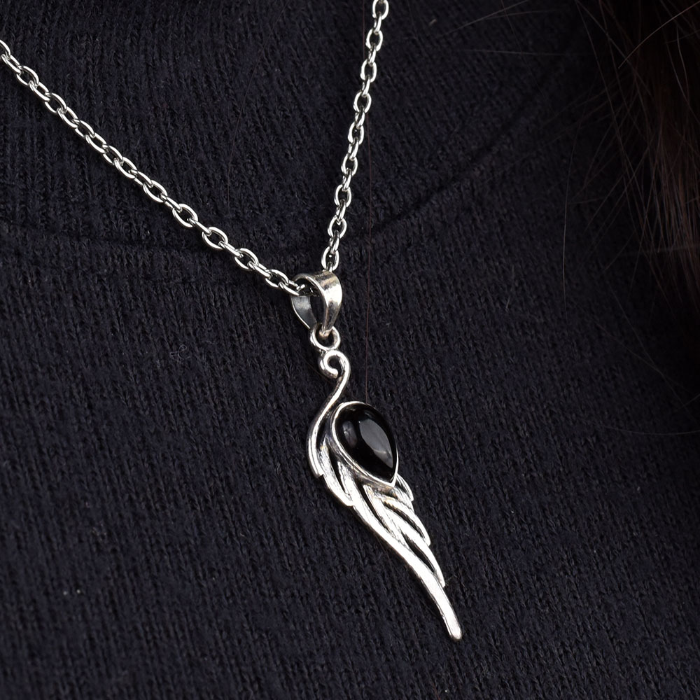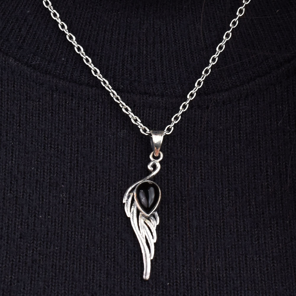 Black Stone Teardrop Feather Embedded 92.5 Sterling Silver Jewelry