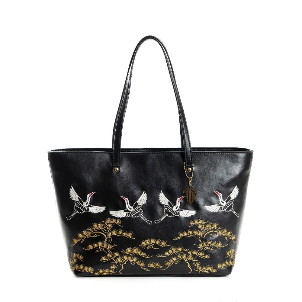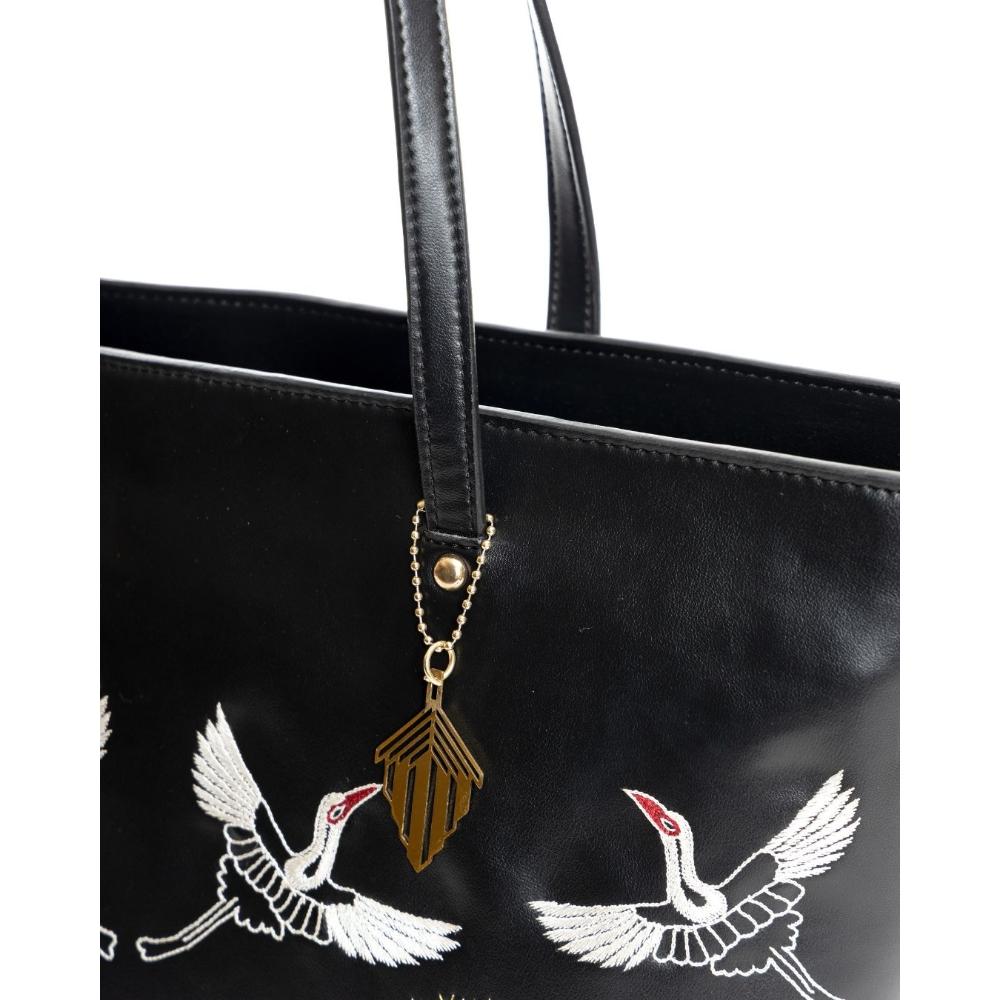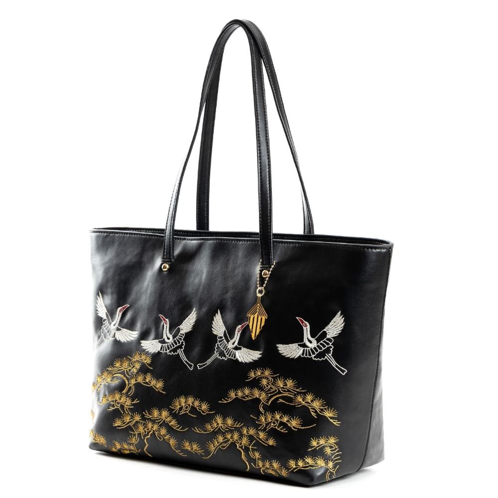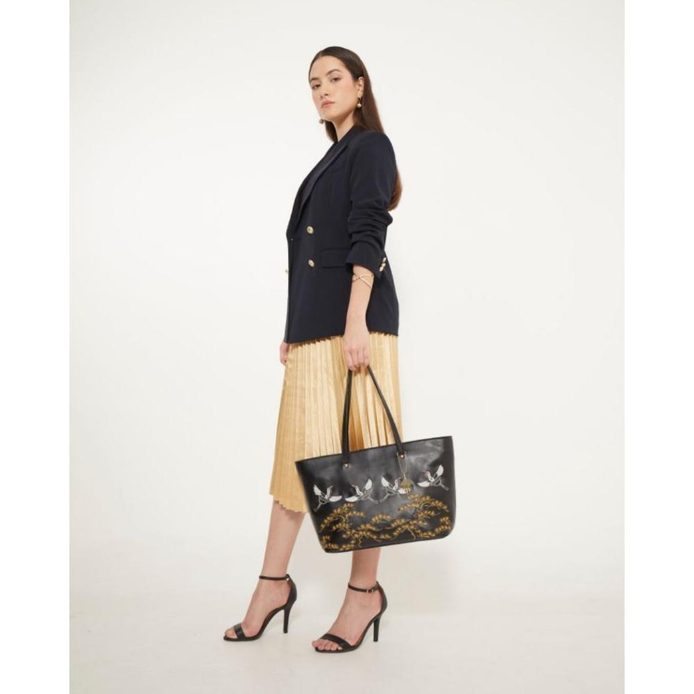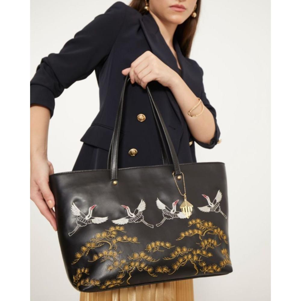 Black Tote Adorned With Golden Floral Bird Embroidery