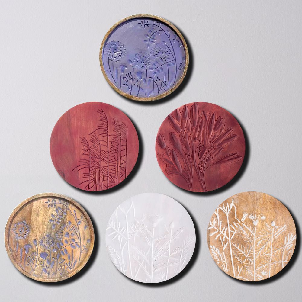 Bring the essence of a blossoming garden into your home with this set of six handcrafted wooden wall plates. Featuring white, muted pink, red, and lavender finishes with delicate floral carvings, each piece adds warmth, color, and artisanal beauty to your walls. Packed & quality-checked by Indianshelf.