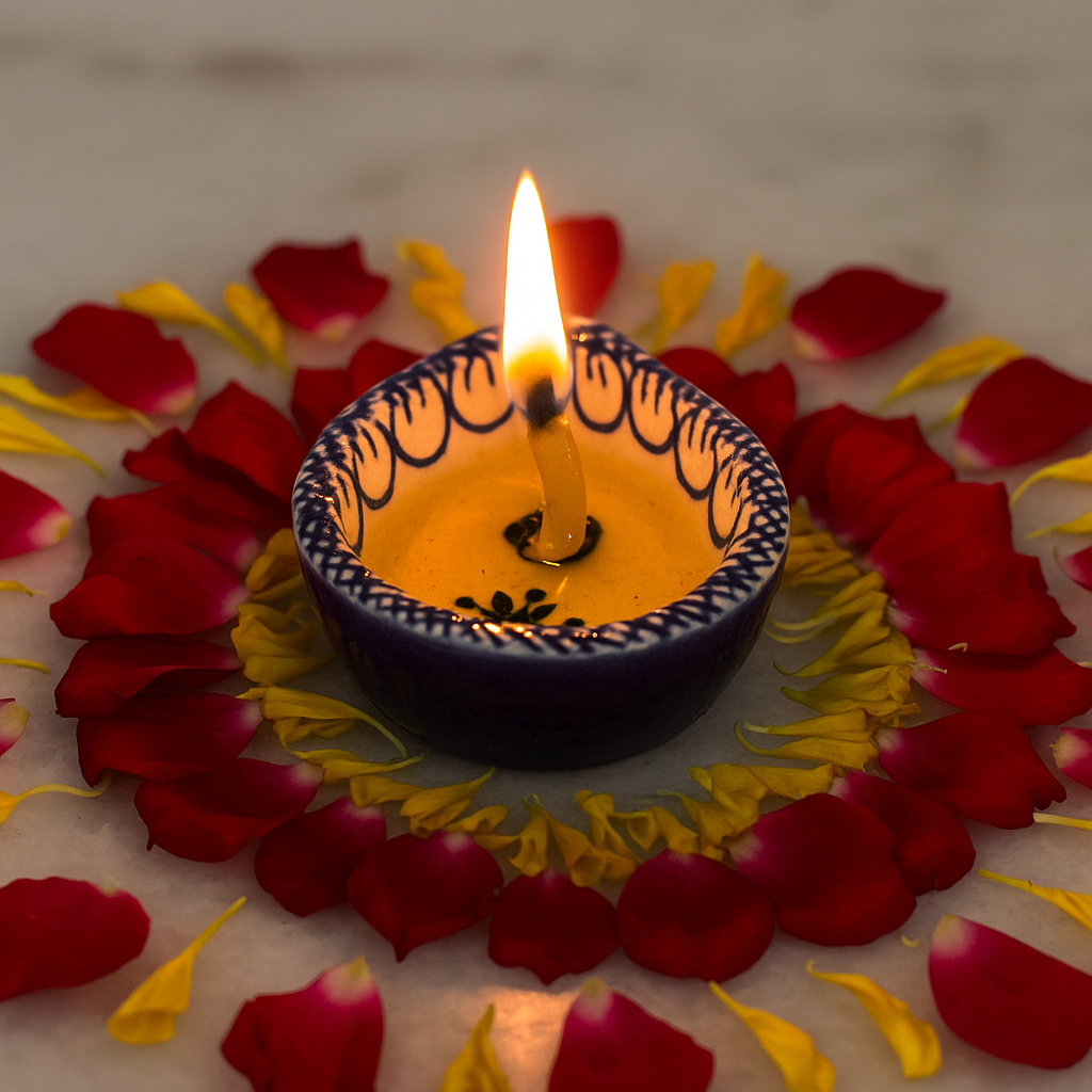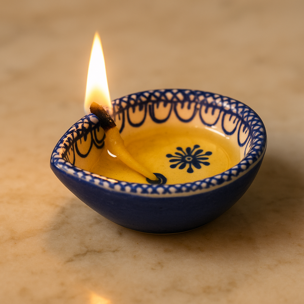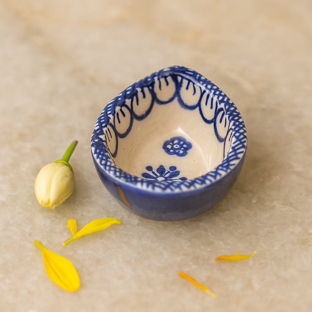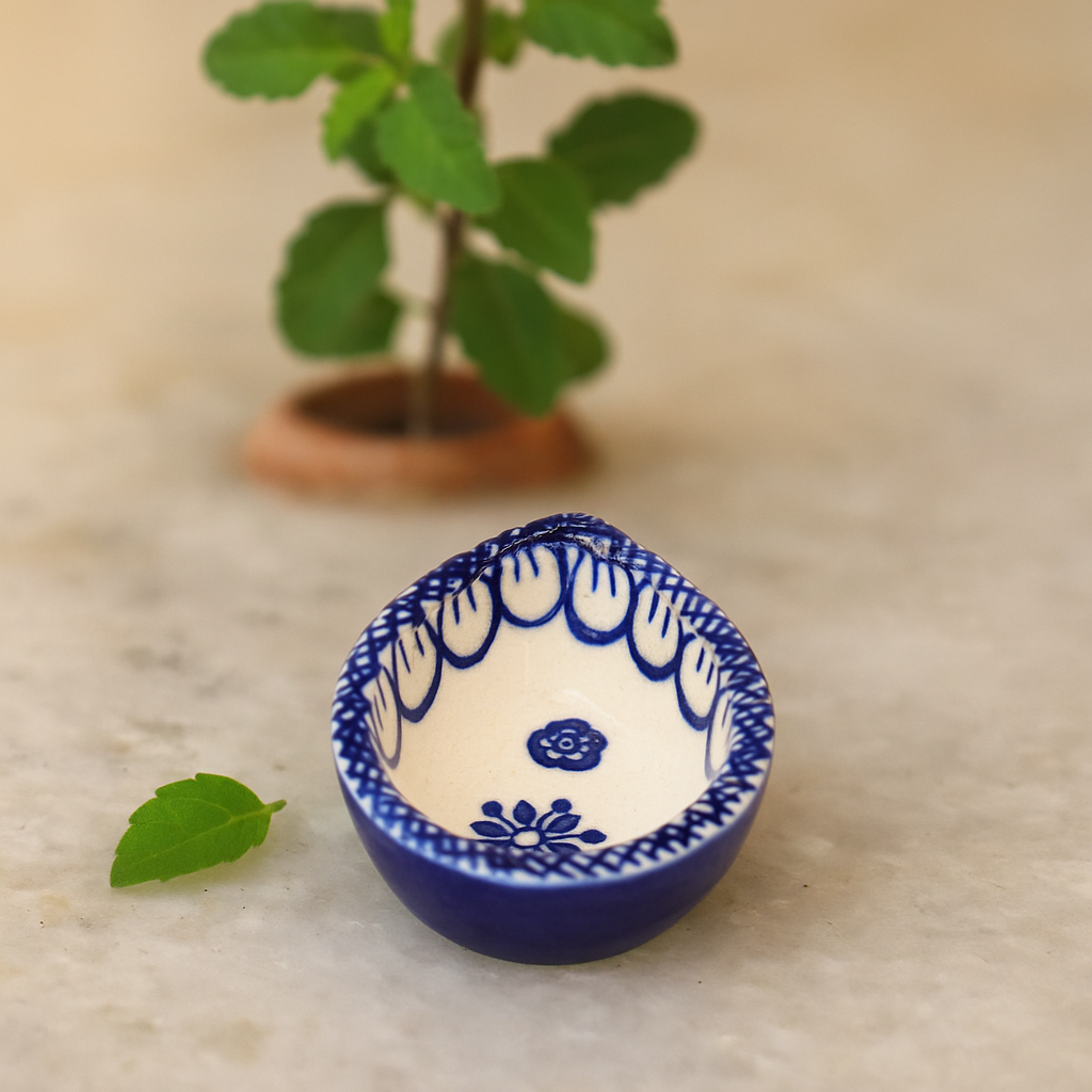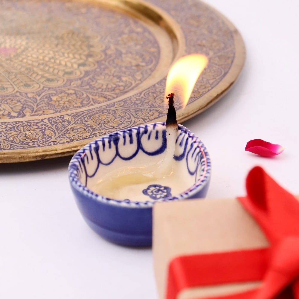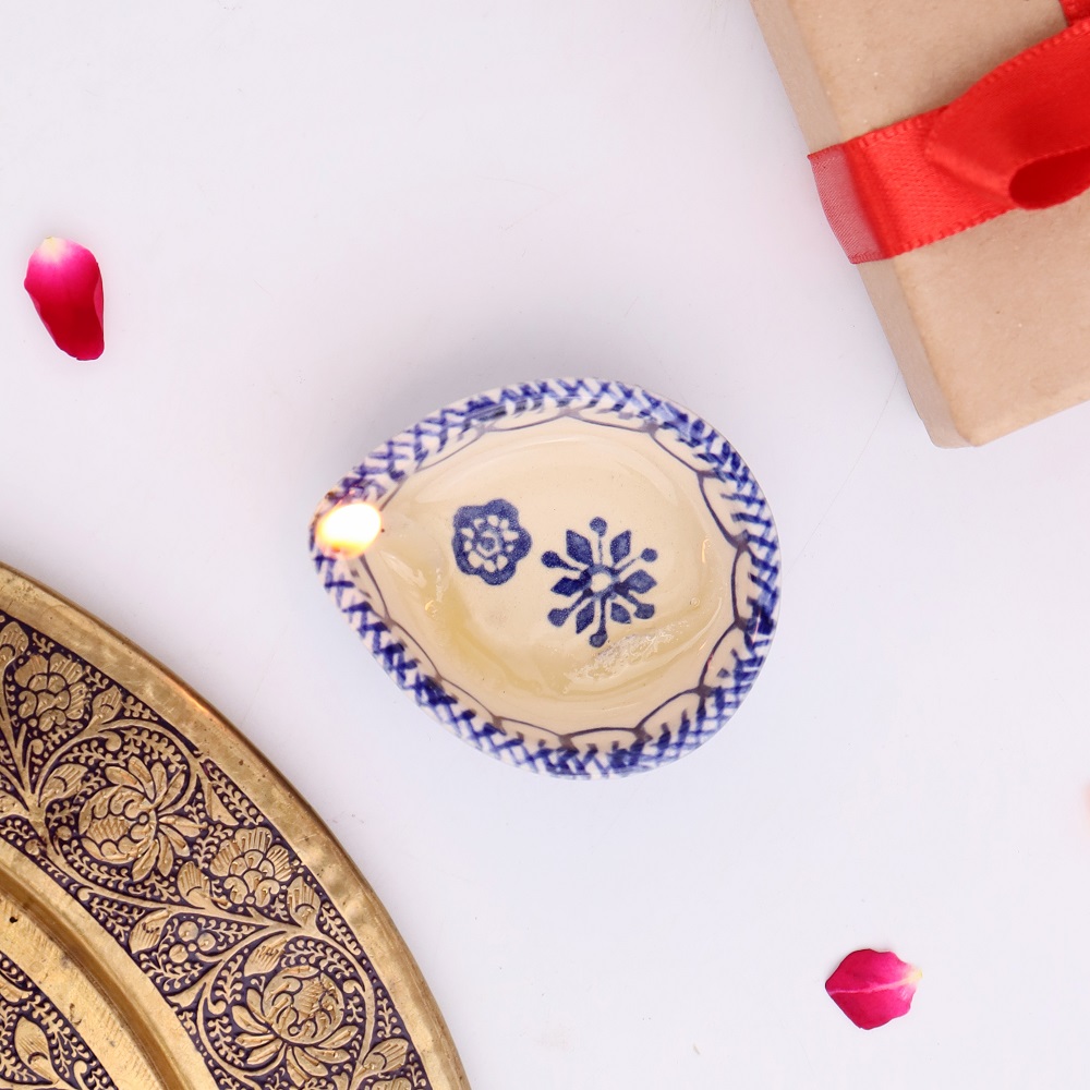 Bring festive radiance into your home with this blue and white ceramic Diwali diya, a handcrafted lamp designed to blend heritage and elegance. Its smooth ceramic surface, detailed with blue hand-painted motifs, creates a timeless aesthetic perfect for puja rituals and seasonal décor. Compact yet striking, this diya not only illuminates your space with warm light but also enhances your interiors with cultural artistry.