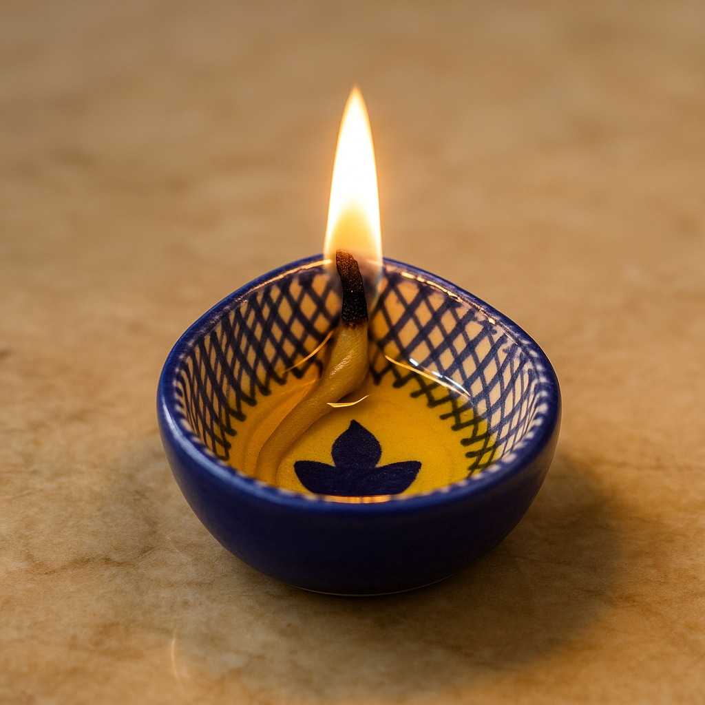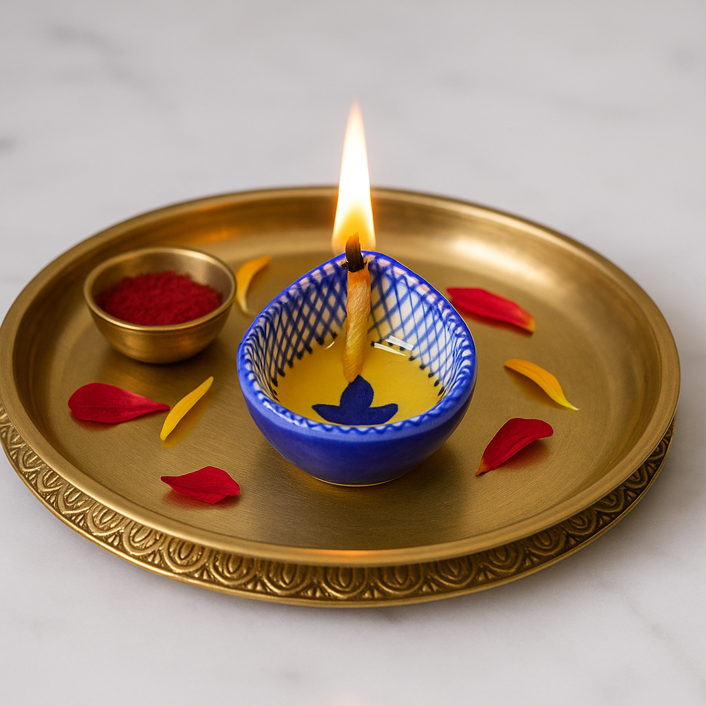 Celebrate the festival of lights with this blue and white design ceramic Diwali diya, beautifully crafted to bring elegance and devotion into your sacred space. Its smooth ceramic base is adorned with hand-painted blue patterns that stand out against the white glaze, creating a classic contrast. Compact in size yet rich in symbolism, this diya is perfect for temple decoration, festive rituals, or as a decorative accent for modern homes. Each piece carries the touch of skilled artisans who keep India’s traditional ceramic craft alive.