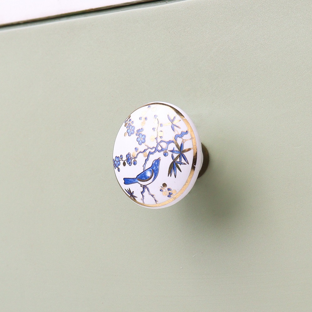 Featuring a captivating blue bird and golden berry details, this drawer knob captures the essence of the natural world. The bright blue bird, set against a graceful floral and berry backdrop, introduces a fun yet refined aspect to your furniture. Made from high-quality ceramic, the knob highlights the intricate details of the design, transforming each piece into a work of art.