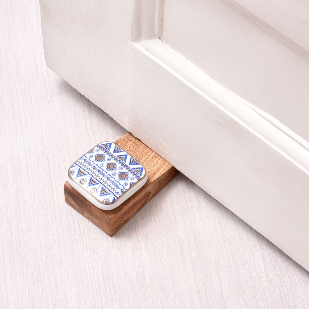 Blue Border Design Square Ceramic Wooden Door Stoper