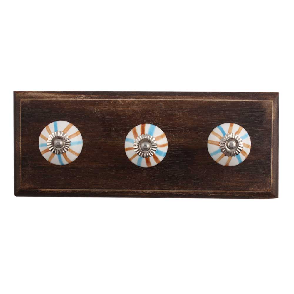 Blue Brown Rays Ceramic Wooden Hook. A Perfect Complement to the Soft Tone of the Wood are these White Traditional Hat & Coat Hook Made of Genuine Porcelain and Brass. It can be use to Hang Jewellery, Leashes, Towels, Scarves, Light Weight Sweaters, Caps Etc.