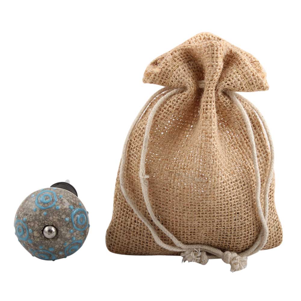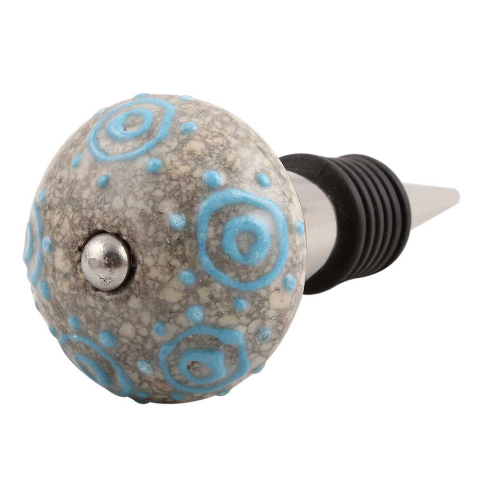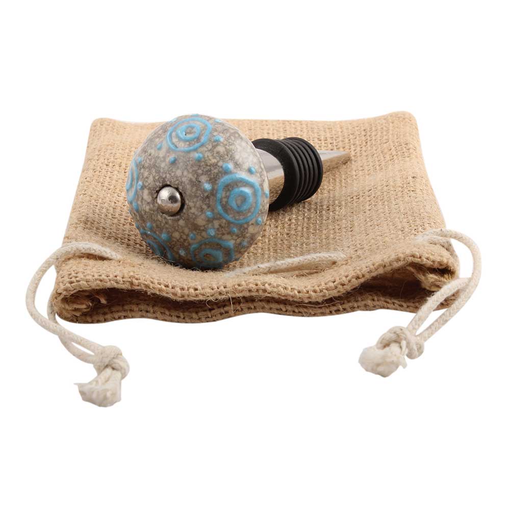 Blue Circles Crackle Ceramic Wine Stopper. Zinc Alloy Wine Bottle Stopper with Attractive Jute Bag Packaging.