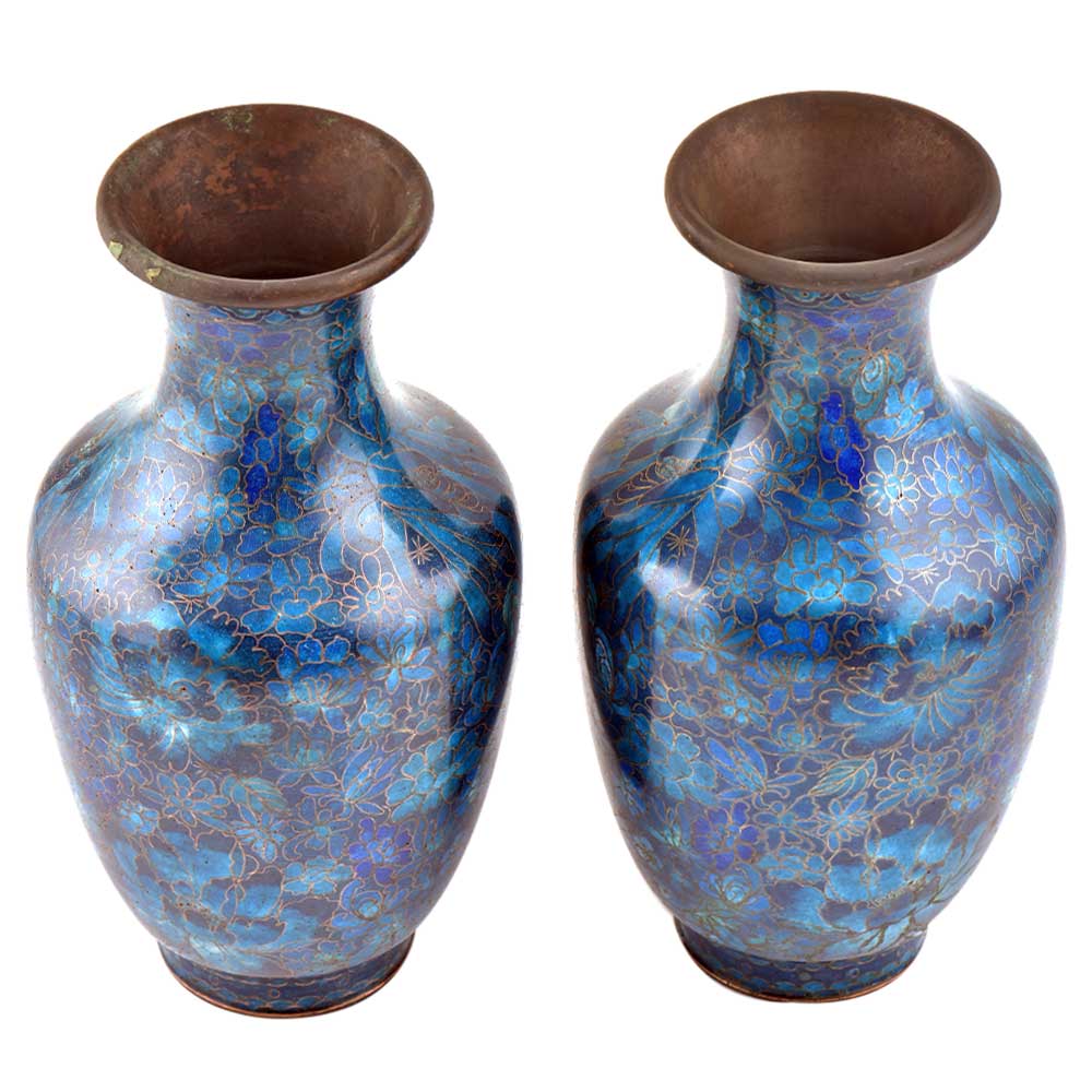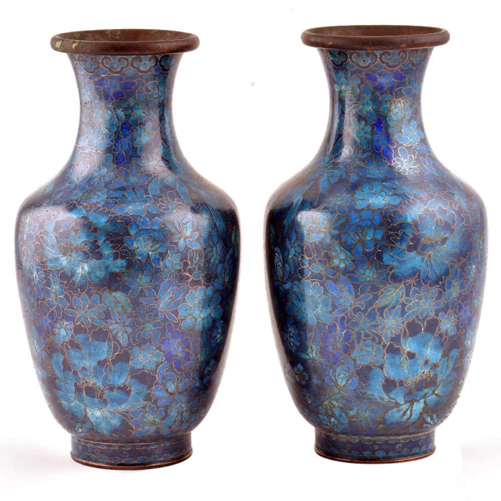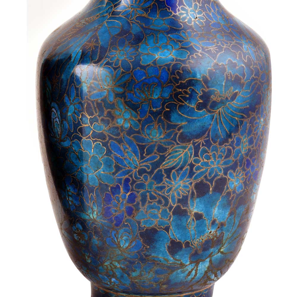 Decorative enameled metal ware called cloisonné exhibit almost superhuman skill by master craftsmen displayed by the marvelous diversity, intricacy and beauty of their designs. Earliest decorative motifs include cloud patterns, lotus flowers, the symbol of purity and beauty later motifs included dragons amid clouds, floral landscapes, scenes from court and mystical animals. Exquisitely detailed petals and leaves with fine color gradations. Fine inlaid wirework at neck and base, which are edged in brass. Exquisitely detailed petals and leaves with fine color gradations. Dark cobalt blue ground with white, rust, orange, yellow, and mauve blossoms; foliage in shades of green edged in rust are some of the popular designs of cloisonné.