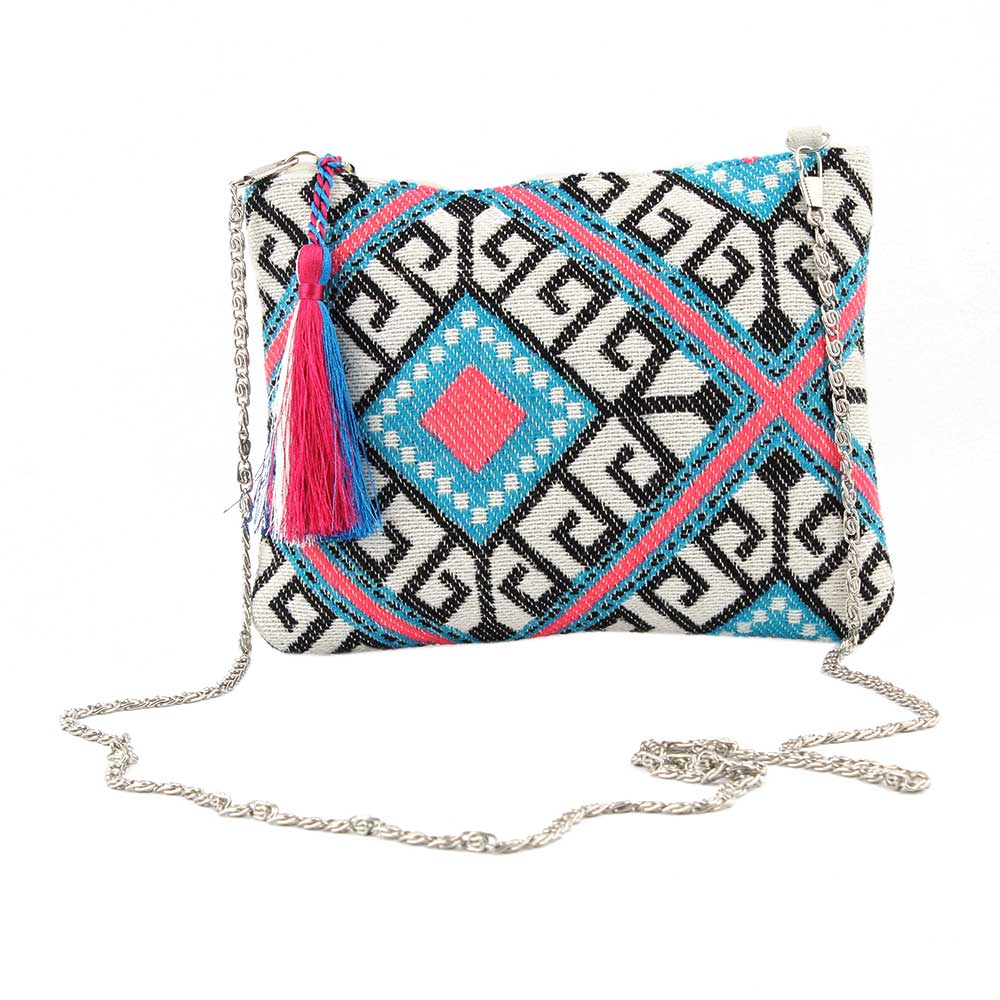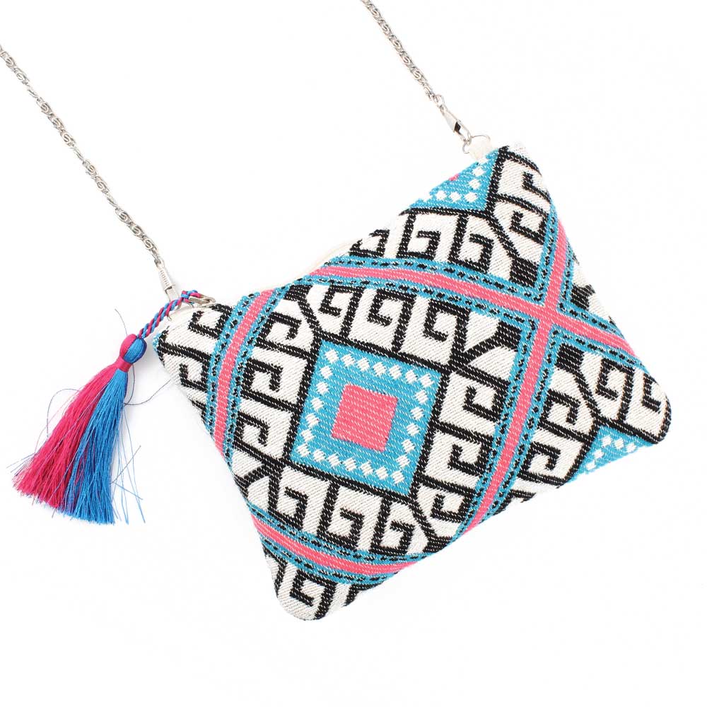 Blue Colorful Ziptop Jacquard Cotton Clutch Bag With Tassle