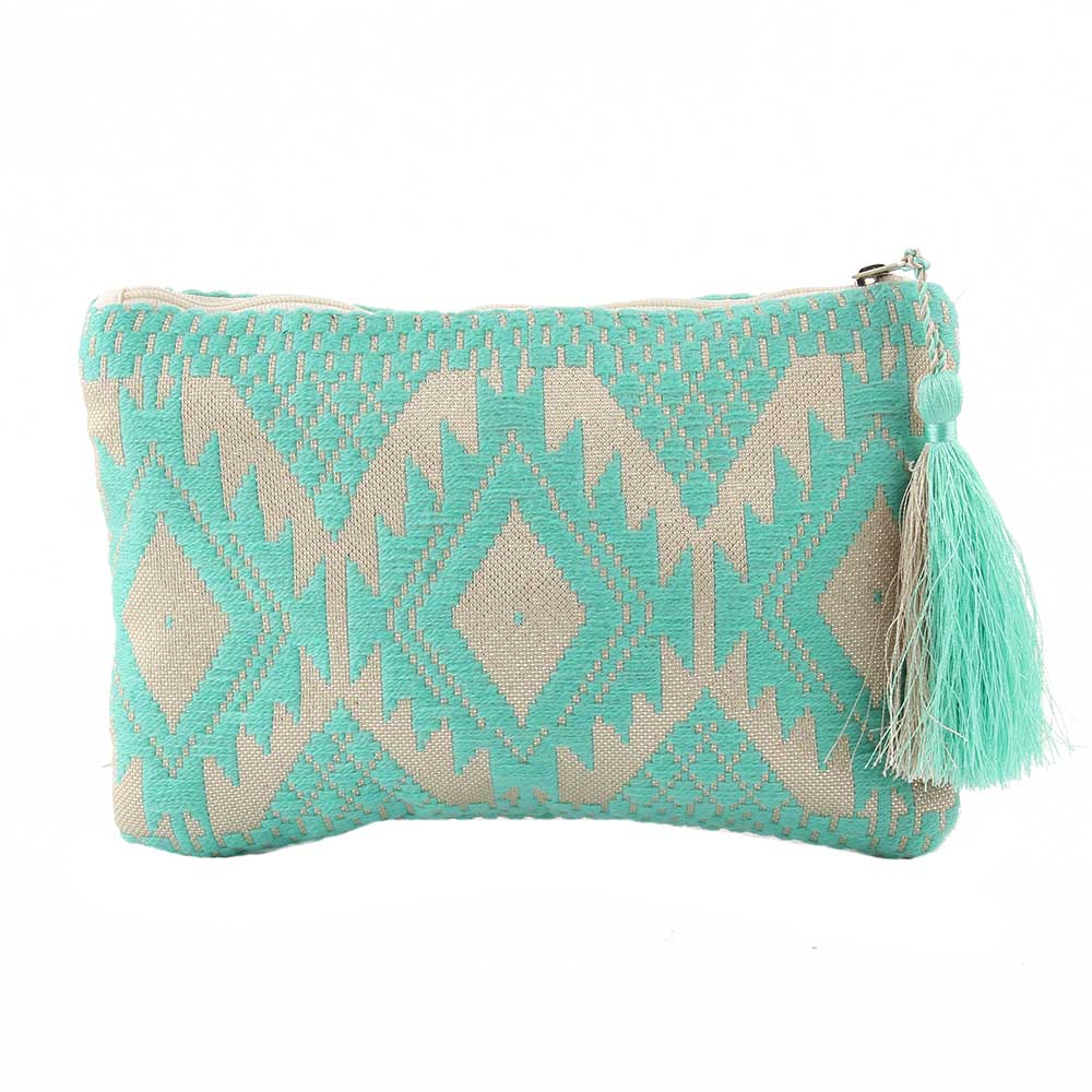 Blue Embroidered ZipTop Jaquard Lurex Zip Top Clutch Bag