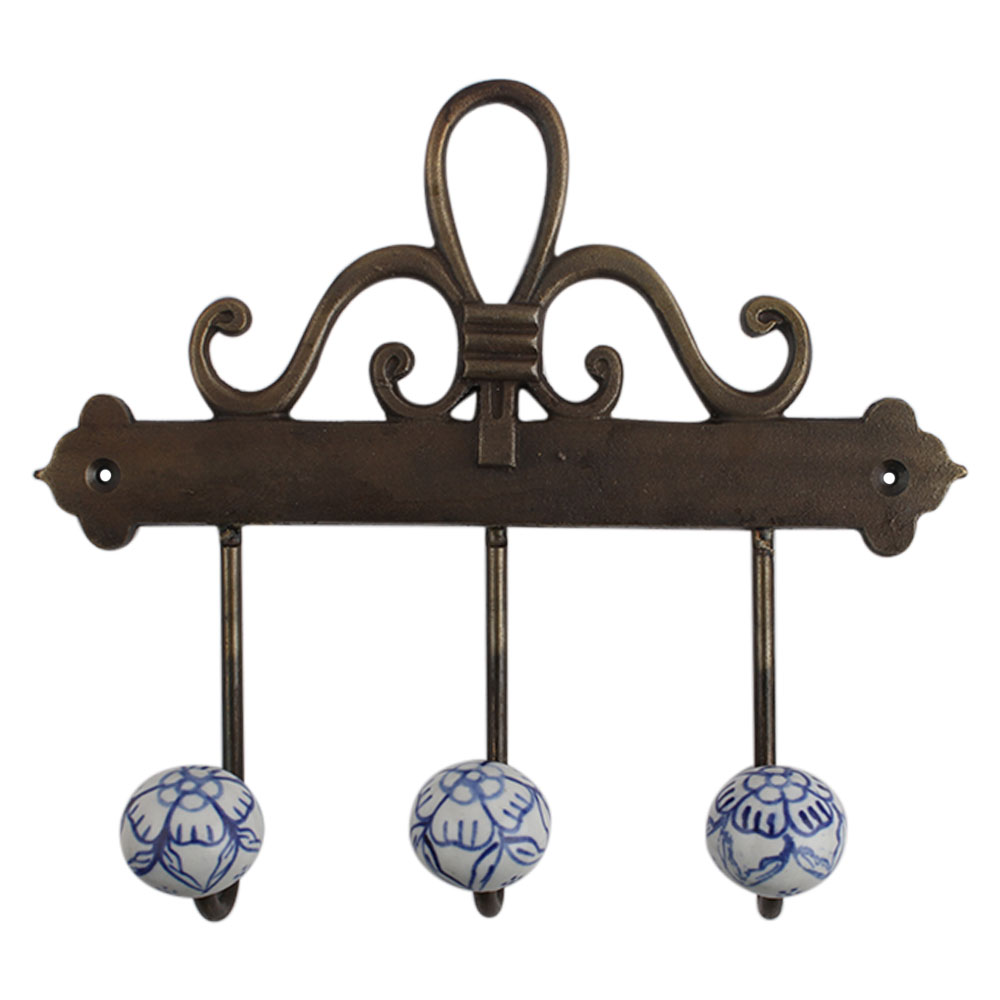 Blue Floral Ceramic Iron Hook. A Perfect Complement to the Soft Tone of the Wood are these White Traditional Hat & Coat Hook Made of Genuine Porcelain and Brass. It can be use to Hang Jewellery, Leashes, Towels, Scarves, Light Weight Sweaters, Caps Etc.