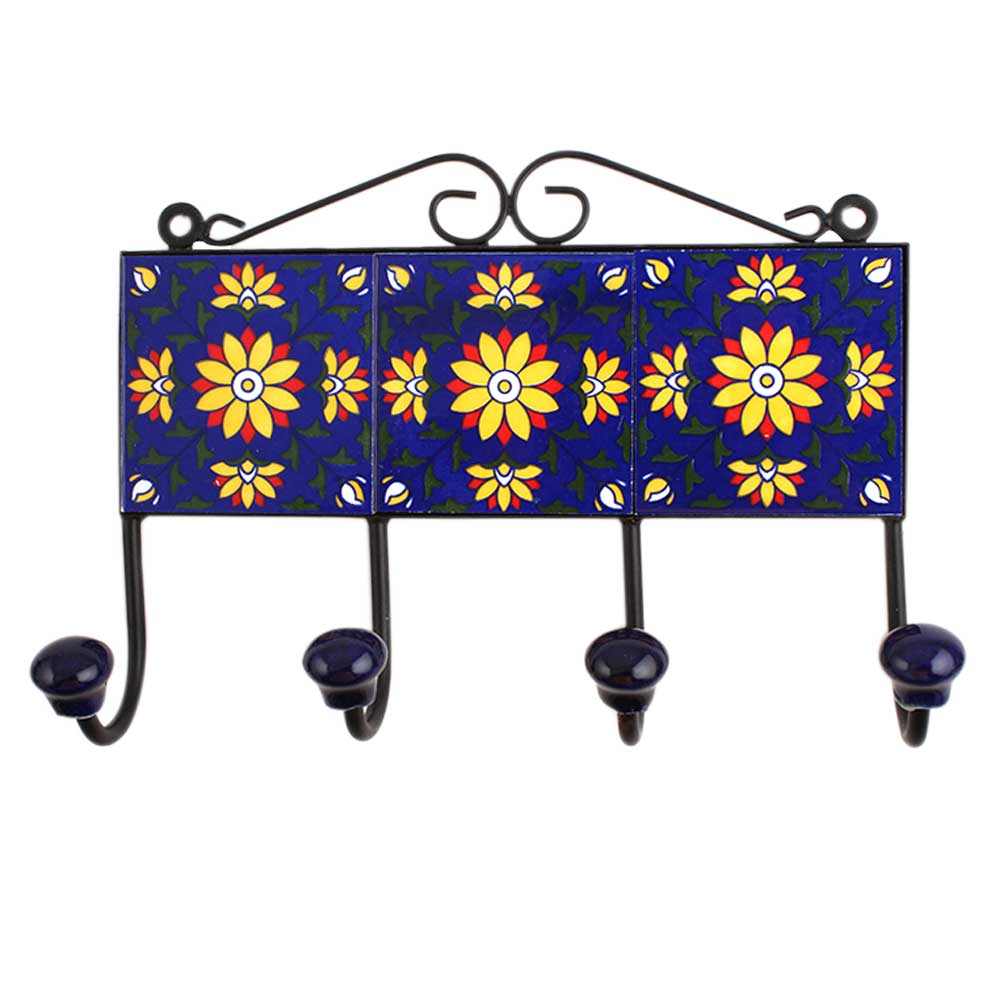 Blue Floral Ceramic Tiles Hooks. When put on wall or cabinet it is an art in itself. The metal part of this hook is black powder coated.