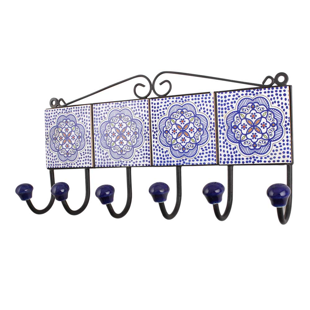 Blue Floral Tiles Hook. When put on wall or cabinet it is an art in itself. The metal part of this hook is black powder coated.