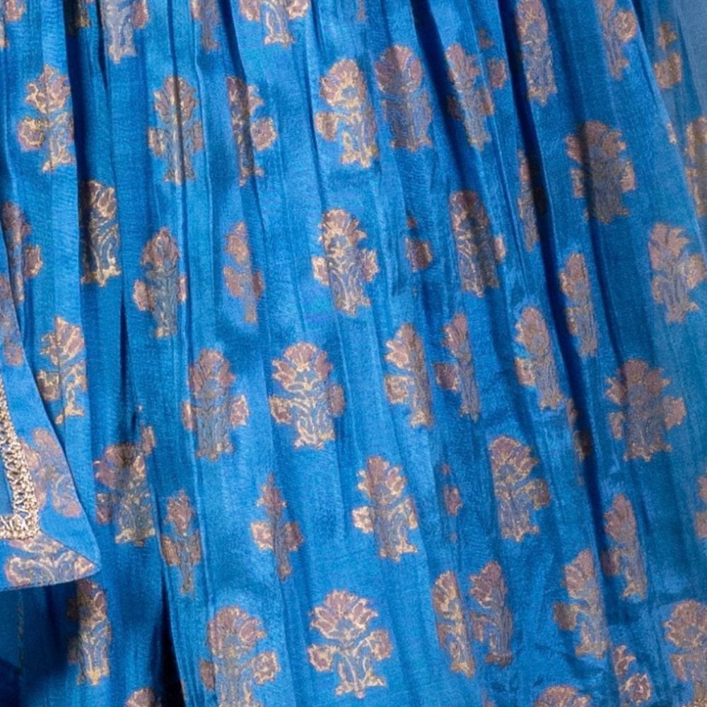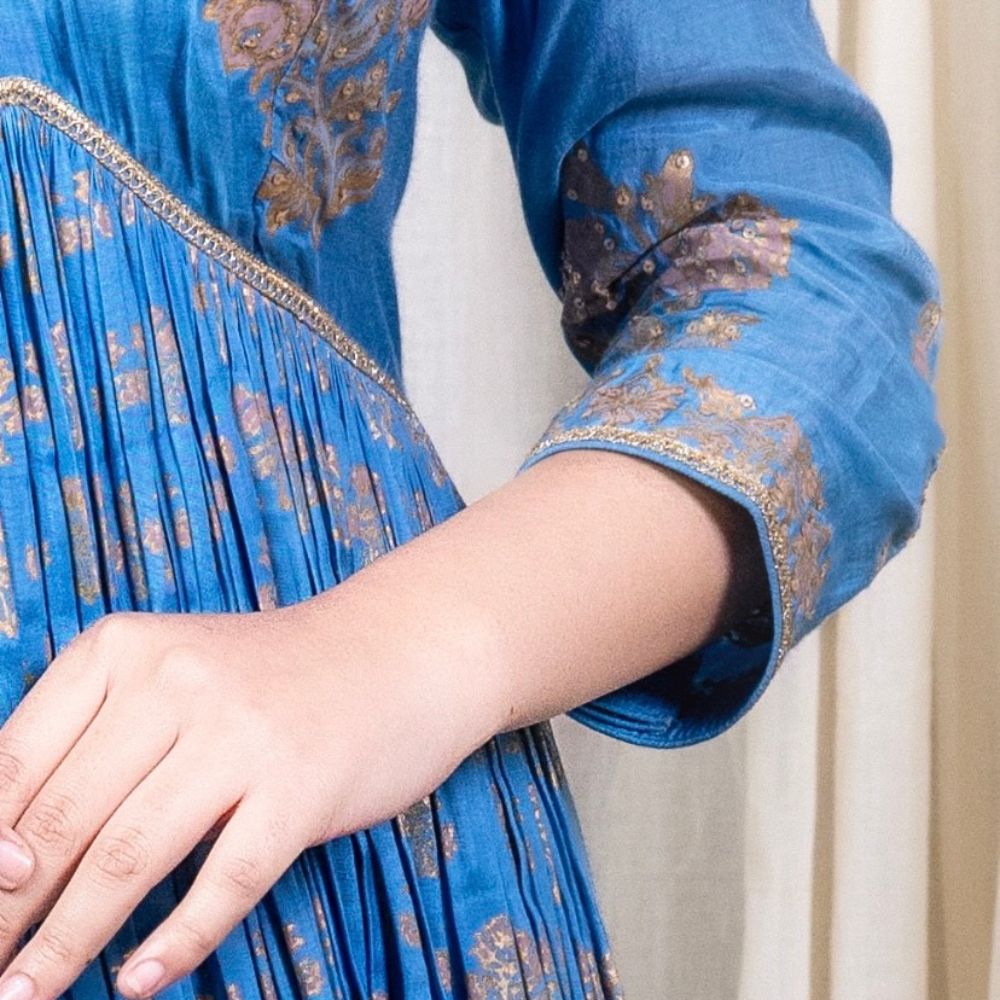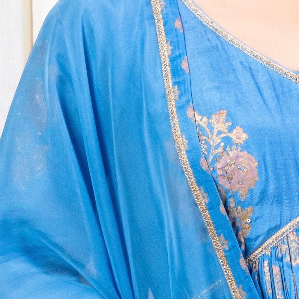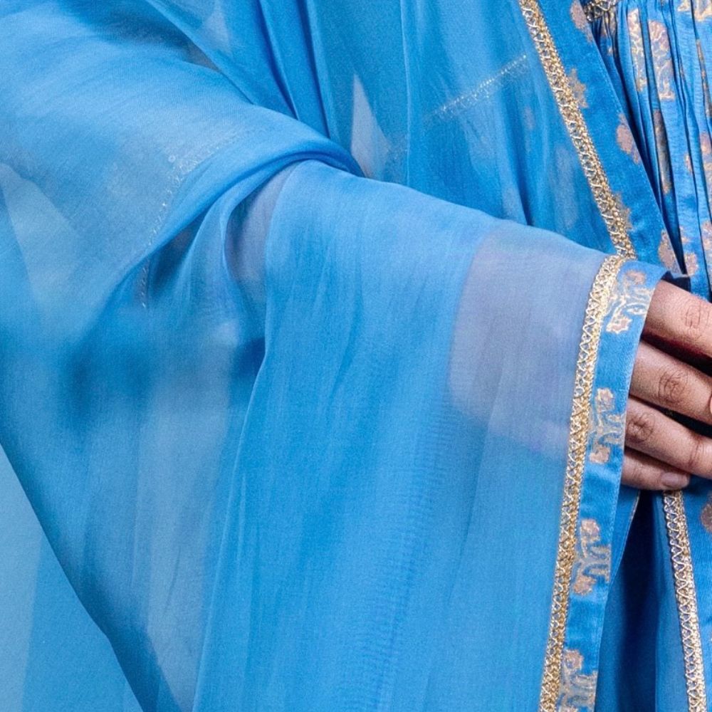 Grace every occasion with timeless elegance in this Blue Gathered Anarkali Set, beautifully crafted in soft muslin fabric and adorned with intricate hand block prints and delicate hand embroidery. The Anarkali features a flattering V-neckline and three-quarter sleeves embellished with elegant threadwork that adds a refined touch to the ensemble. The gathered flare provides a regal flow and a comfortable fit, making it perfect for long celebrations or formal events. Paired with a breathable cotton bottom for added comfort, this set blends traditional design with modern wearability. The look is completed with a luxurious viscose organza dupatta, accented with printed and embroidered borders that elevate its grace. The rich blue hue and gold accents make this outfit ideal for festive evenings, wedding functions, or cultural celebrations. Radiating craftsmanship and sophistication, this handcrafted Anarkali set is a wardrobe essential for those who value style, tradition, and fine detailing.
