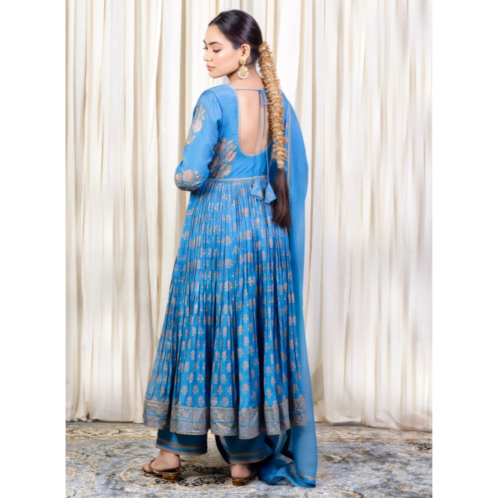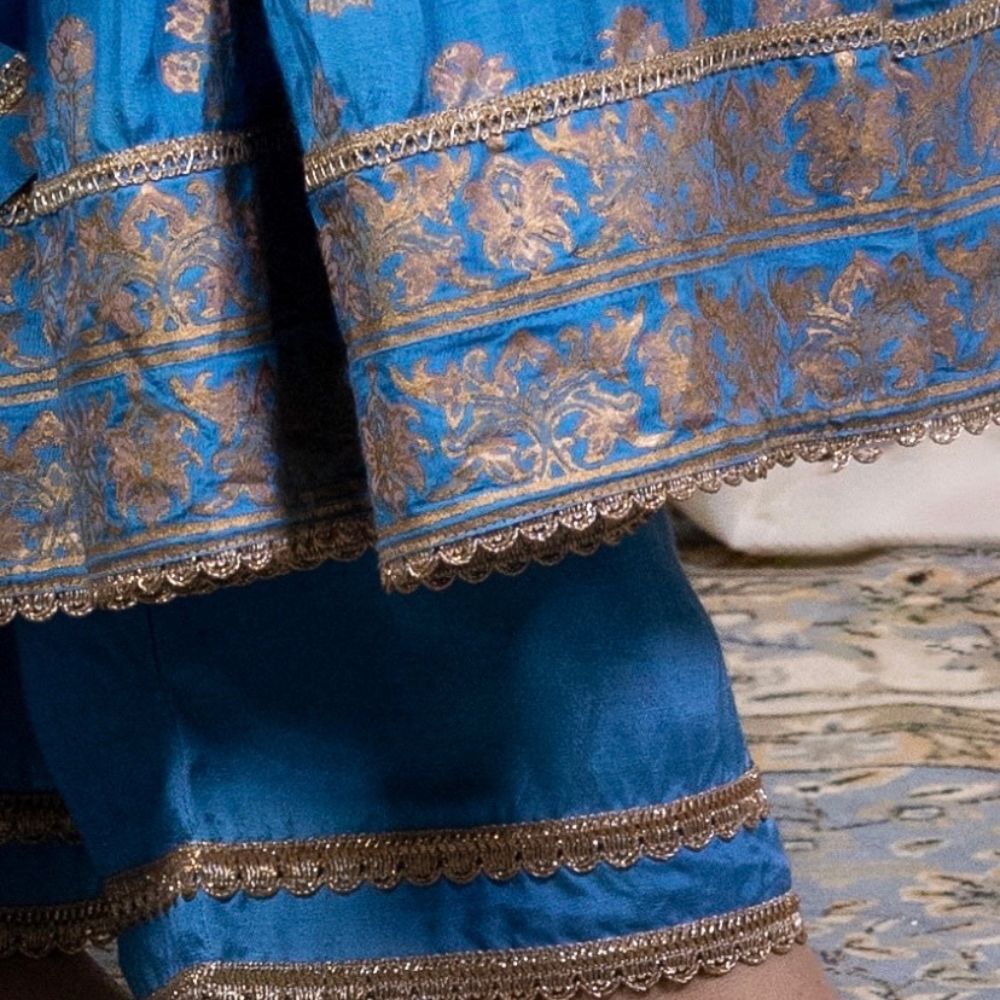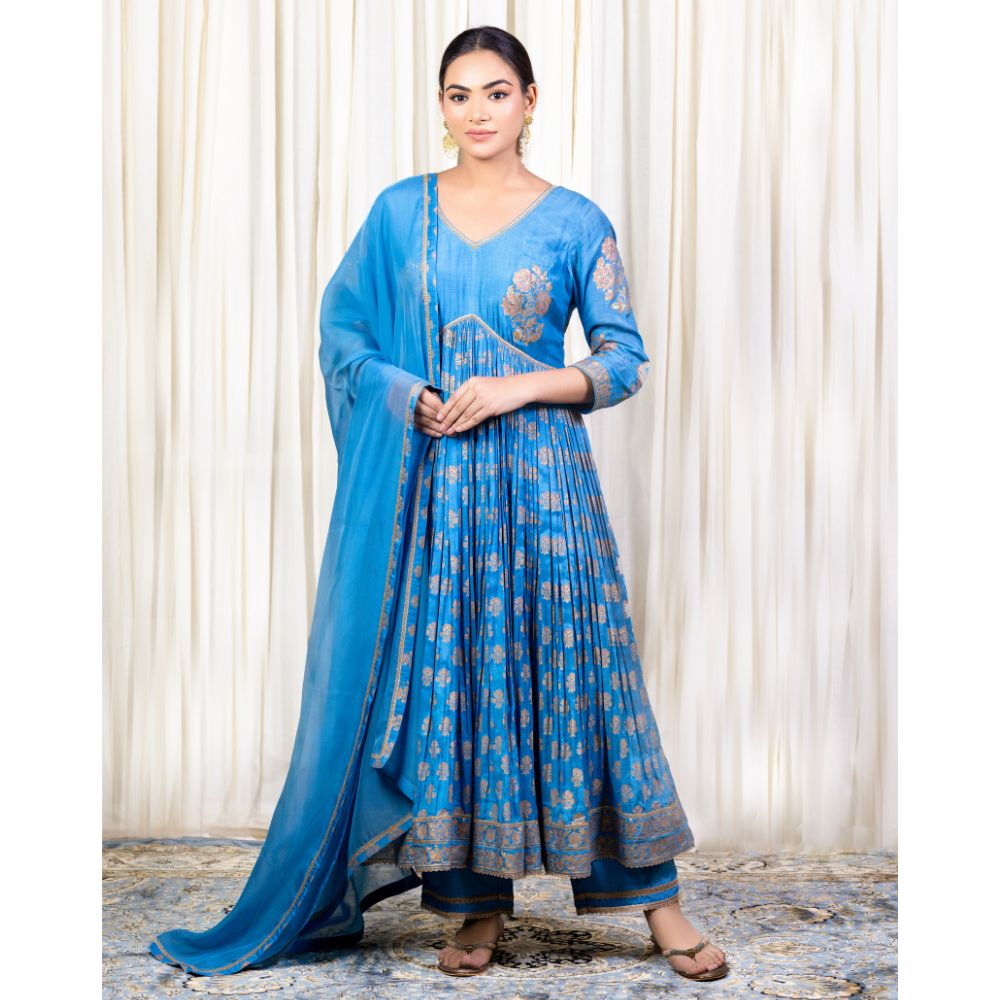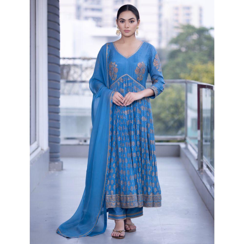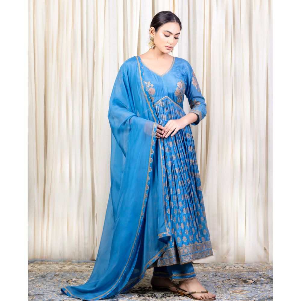 Grace every occasion with timeless elegance in this Blue Gathered Anarkali Set, beautifully crafted in soft muslin fabric and adorned with intricate hand block prints and delicate hand embroidery. The Anarkali features a flattering V-neckline and three-quarter sleeves embellished with elegant threadwork that adds a refined touch to the ensemble. The gathered flare provides a regal flow and a comfortable fit, making it perfect for long celebrations or formal events. Paired with a breathable cotton bottom for added comfort, this set blends traditional design with modern wearability. The look is completed with a luxurious viscose organza dupatta, accented with printed and embroidered borders that elevate its grace. The rich blue hue and gold accents make this outfit ideal for festive evenings, wedding functions, or cultural celebrations. Radiating craftsmanship and sophistication, this handcrafted Anarkali set is a wardrobe essential for those who value style, tradition, and fine detailing.