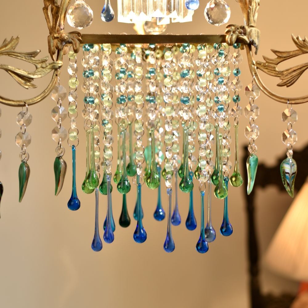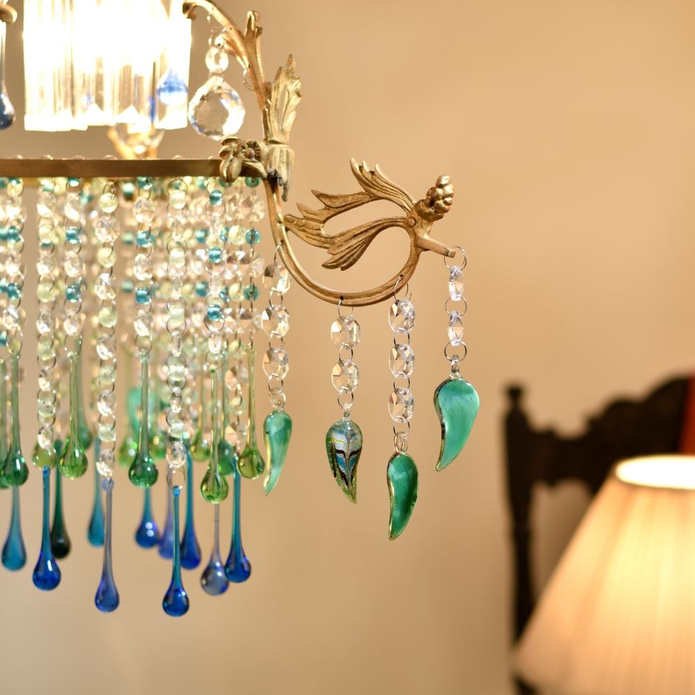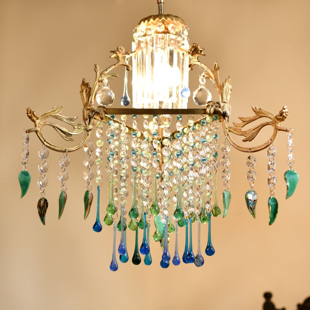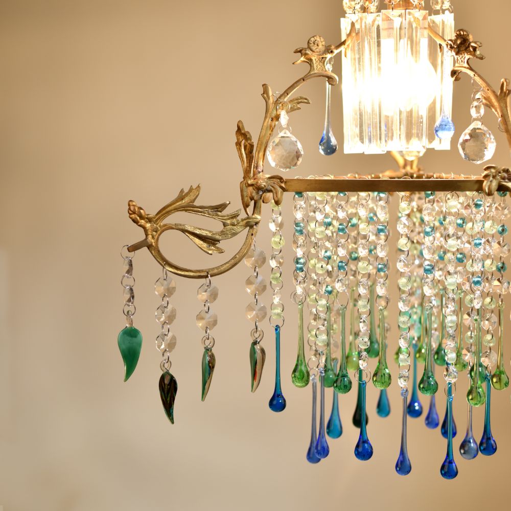 A high-quality brass and glass chandelier that is a masterpiece of elegance and sophistication. Crafted with precision and attention to detail, this stunning fixture combines the richness of brass with the delicacy of glass to create a timeless piece of art that adds a touch of grandeur to any space. Inside the gracefully designed brass frame, a radiant bulb illuminates the surroundings, casting a warm and inviting glow. The charm of this chandelier lies not only in its brilliant illumination but also in the captivating crystal clear finish of its hangings. The crystal-clear accents bring a sense of transparency and purity, while the green and blue-coloured hangings introduce a subtle yet enchanting splash of colour, adding a mesmerizing contrast to the overall design. This chandelier is a versatile statement piece that complements various settings, making it perfect for your home, restaurant, hotel, or cafe decoration. Its dazzling appearance instantly transforms any space into a luxurious haven, leaving a lasting impression on all who behold it. With an adorable and eye-catching design, this chandelier becomes an awe-inspiring focal point, drawing attention and admiration from all angles. It is not only a magnificent addition to your decor but also a thoughtful and meaningful gift for your loved ones on special, festive, or auspicious occasions, conveying your affection and appreciation in a memorable way.