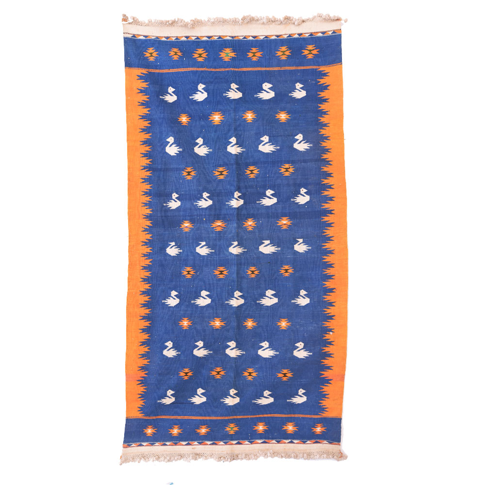 Blue Handmade Durry With Floral Duck Design With Orange Border.