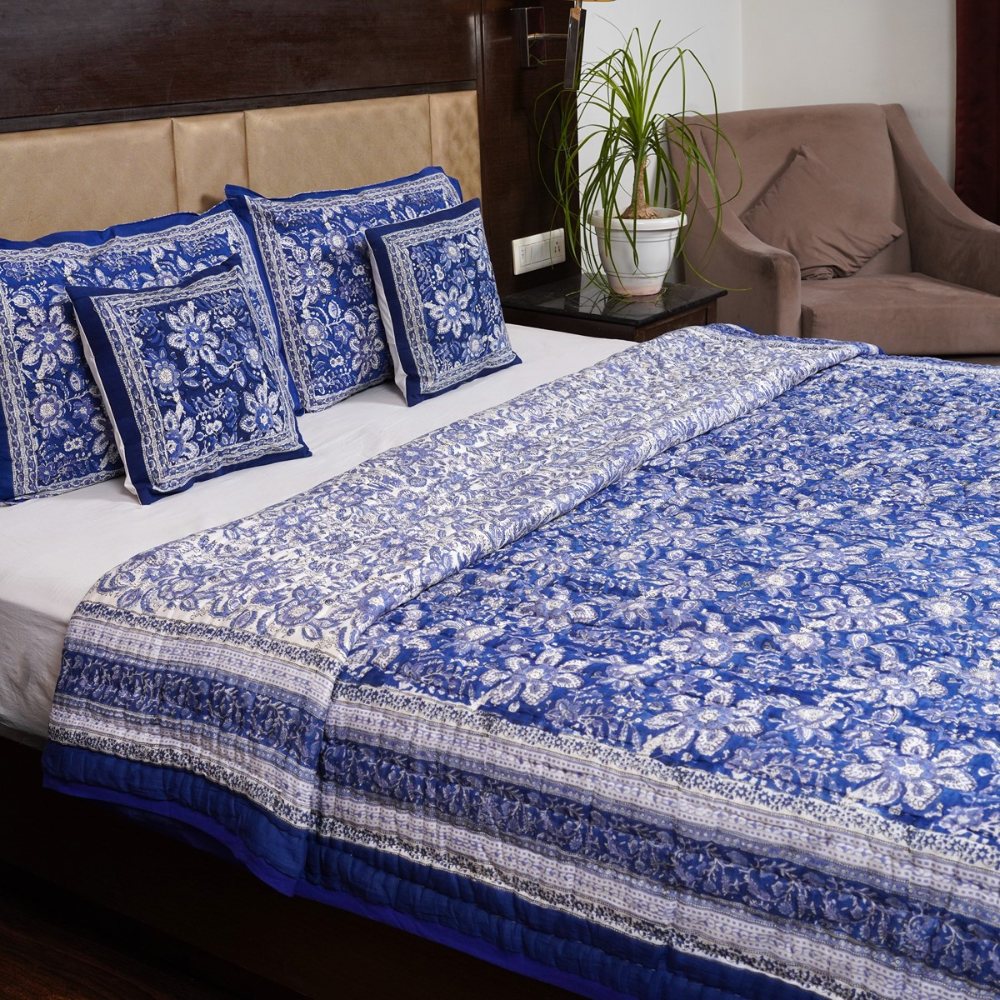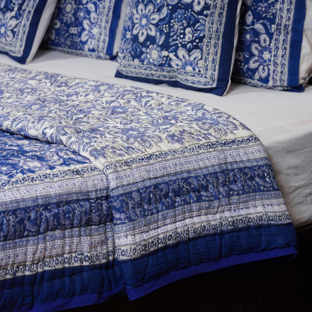 This royal indigo Malmal (Voile) quilt showcases exquisite floral hand-block prints crafted by skilled Indian artisans. Made from lightweight cotton voile, it combines breathability, elegance, and traditional artistry. Lovingly handmade and quality-checked by Indianshelf, it’s designed to bring a royal touch to your bedroom décor.