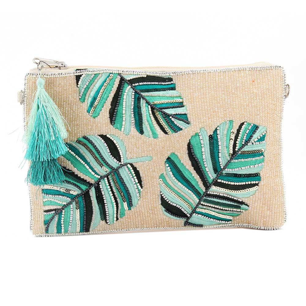 Blue Leaves On White Glass Beads And Cotton Clutch Bag