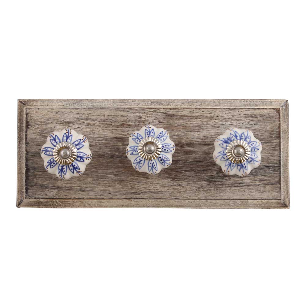 Blue Lotus Ceramic Wooden Hook. A Perfect Complement to the Soft Tone of the Wood are these White Traditional Hat Coat Hook Made of Genuine Porcelain and Brass. It can be use to Hang Jewellery, Leashes, Towels, Scarves, Light Weight Sweaters, Caps Etc.