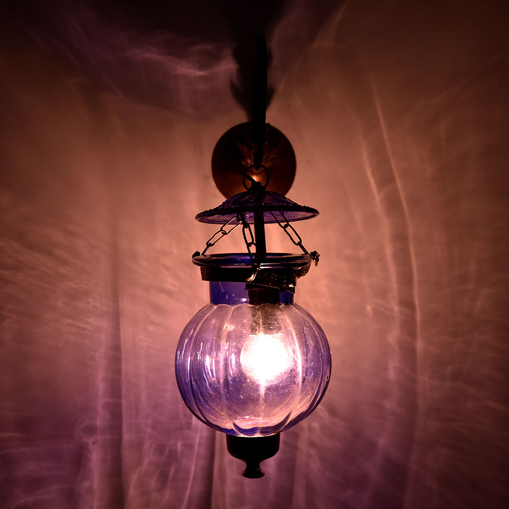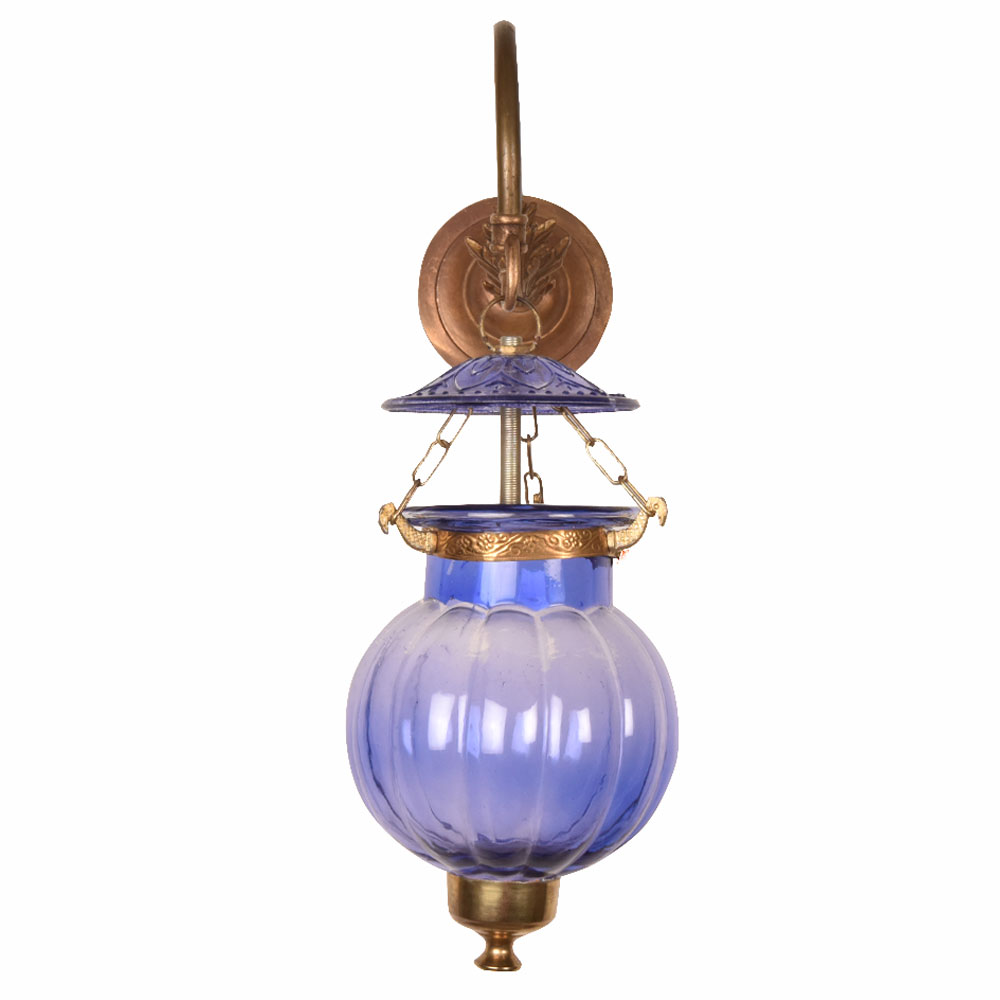 Light blue pumpkin shaped glass hanging lamp on leafy bronze bracket. The lamp is unique and allows a great lighting option for any room.