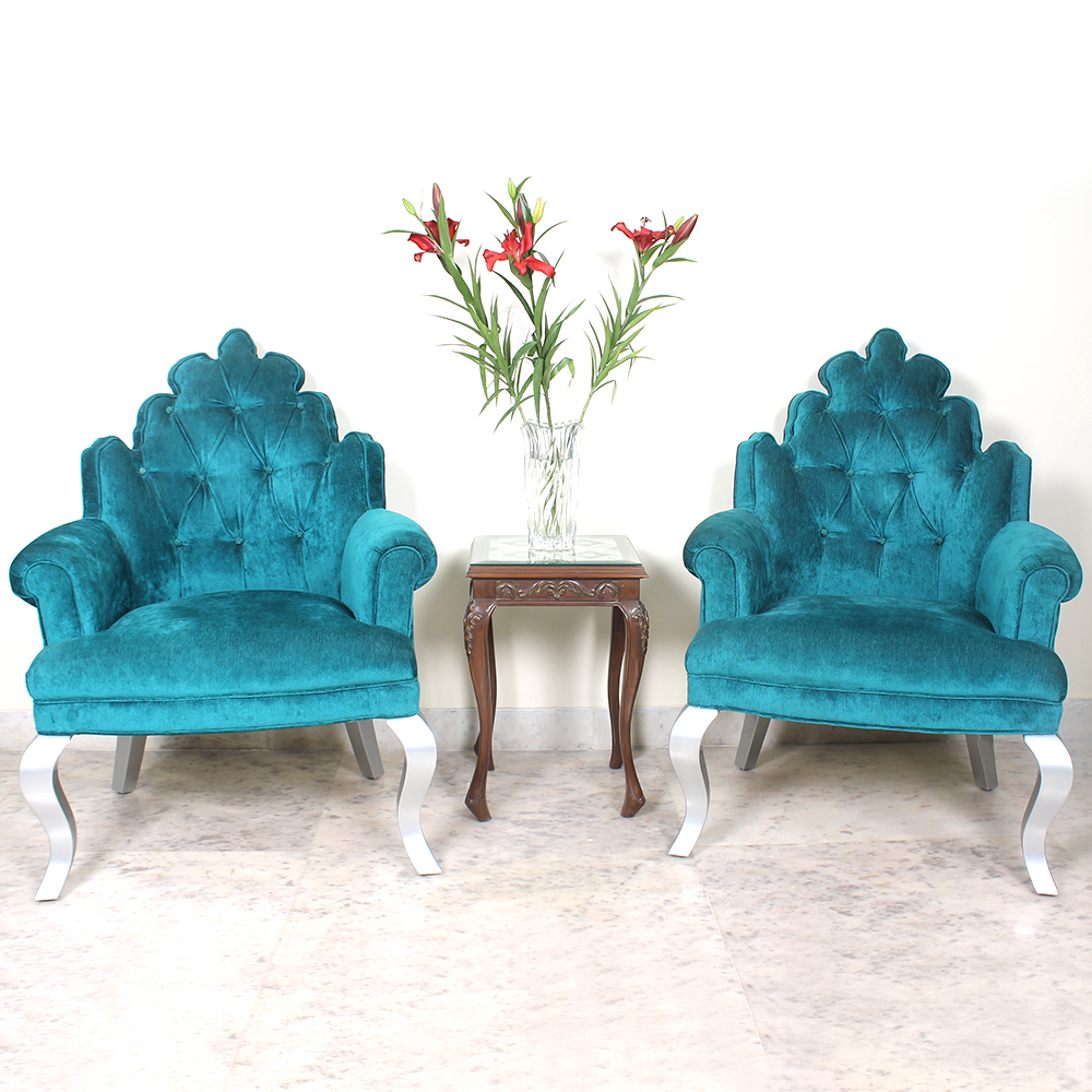 Living room chairs with rolled arm detail unique shape of back with beautiful turquoise fabric and weaved botton tufting detail. Its cabriole legs are finished in grey PU in a high gloss finish .
