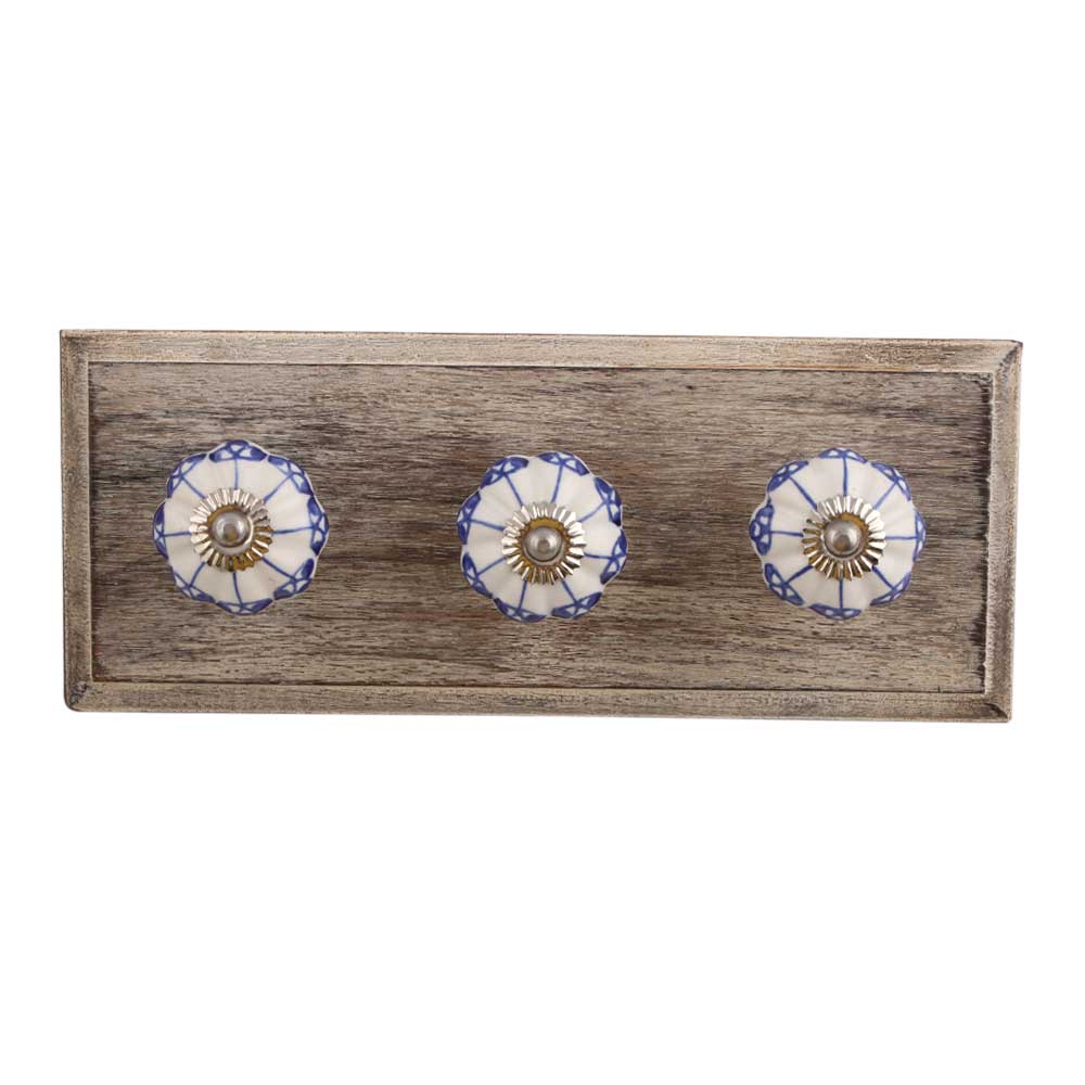 Blue Shamrock Ceramic Wooden Hook. A Perfect Complement to the Soft Tone of the Wood are these White Traditional Hat & Coat Hook Made of Genuine Porcelain and Brass. It can be use to Hang Jewellery, Leashes, Towels, Scarves, Light Weight Sweaters, Caps Etc.