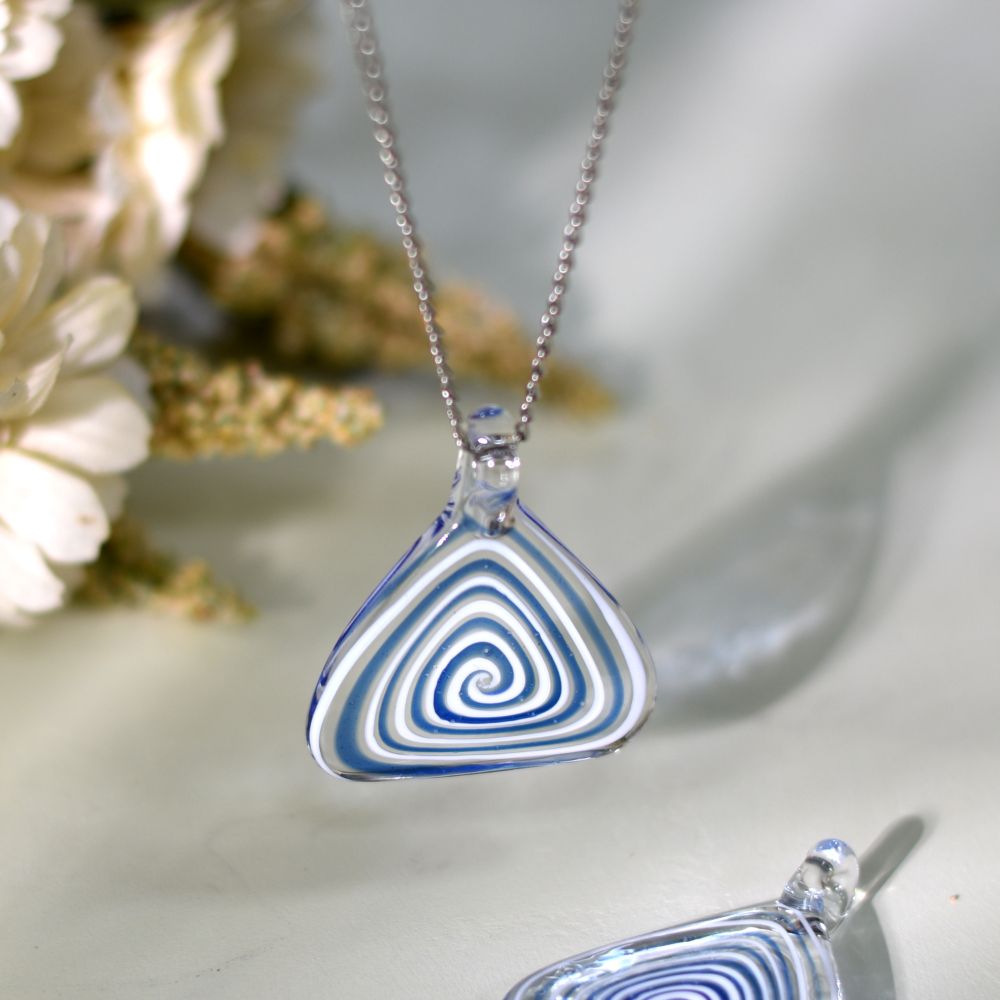 The Blue Spiral Triangle Lampwork Glass Pendant is a unique and striking piece of jewelry that beautifully combines intricate craftsmanship with bold design. Handcrafted using the traditional lampwork technique, this pendant features a mesmerizing spiral pattern in shades of blue. The triangular shape adds a modern touch, making it a versatile and eye-catching accessory for any occasion. Whether you're looking to create a statement necklace or add a pop of color to your collection, this pendant will captivate with its beauty and style.