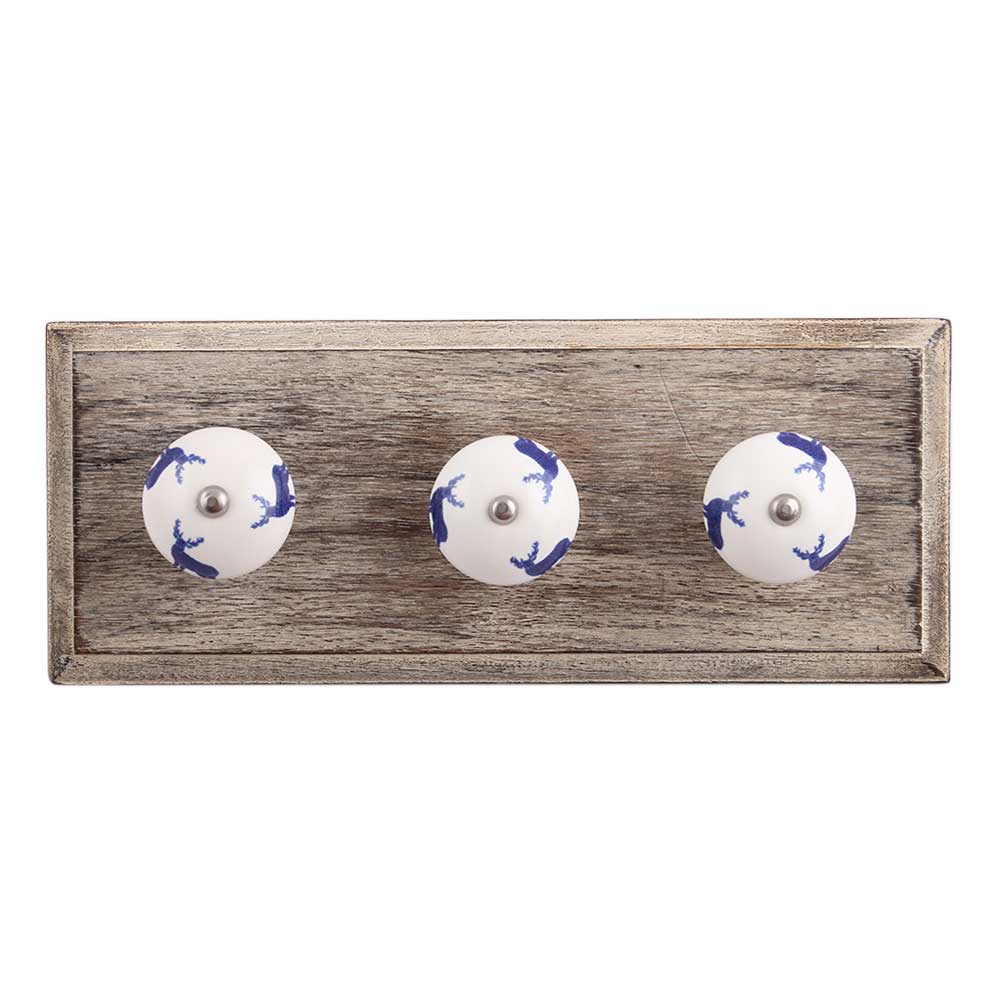 Blue Standing Rein Deer Pattern Ceramic Wooden Hook. A Perfect Complement to the Soft Tone of the Wood are these White Traditional Hat & Coat Hook Made of Genuine Porcelain and Brass. It can be use to Hang Jewellery, Leashes, Towels, Scarves, Light Weight Sweaters, Caps Etc.
