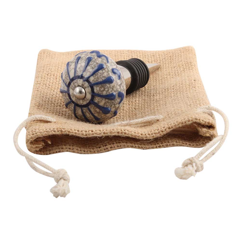 Blue Wheel Crackle Ceramic Wine Stopper.Zinc Alloy Wine Bottle Stopper with Attractive Jute Bag Packaging.