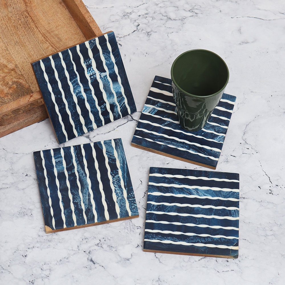 Indianshelf.com for bulk/wholesale orders.Indianshelf.us for personal purchases.Add a pop of vibrant color and contemporary style to your home with the Blue & White Modern Wooden Coasters. These coasters are designed to blend elegance with practicality, offering a unique and modern touch to any room. The bold blue and white design makes them a perfect addition to any table, whether you're entertaining guests or simply enjoying your favorite beverage.