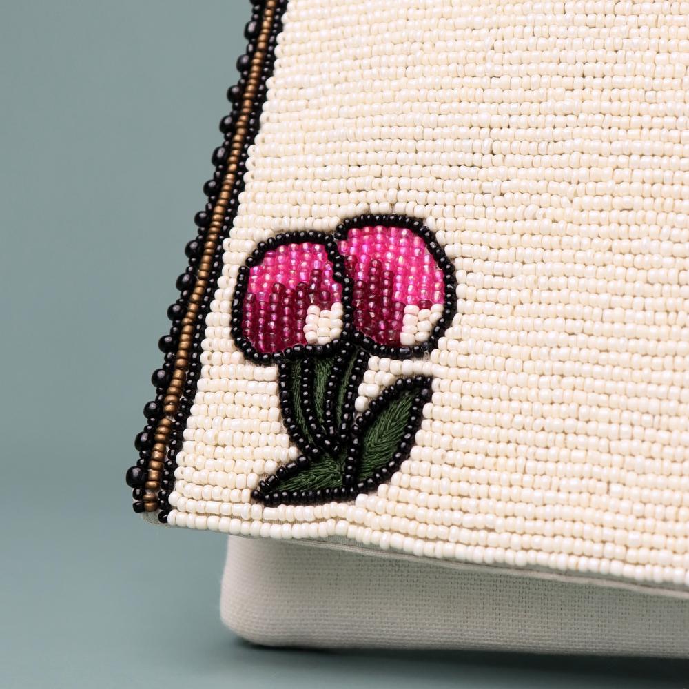 Delicate and charming, the Blush Bloom Beaded Clutch is a minimalist statement piece for the modern woman. Featuring intricate ivory beadwork on a soft fabric base, the clutch is beautifully accented with a petite pink flower motif in one corner—an ode to subtle elegance. The sleek silhouette is complemented by a gold-tone chain strap, offering versatile wear as a clutch or a crossbody.