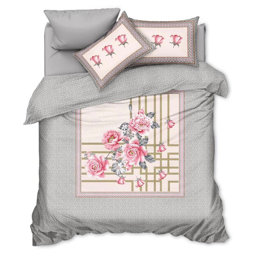 Add a soft romantic flair to your bedroom with this Blush Pink Rose Queen Size Bedsheet Set. Featuring a graceful digital panel print of blooming roses and artistic golden grid lines, this bedsheet set combines modern aesthetics with timeless floral beauty. Made from premium Heavy Glace Cotton, it offers a smooth, durable surface with a refined finish.The set includes one non-fitted (flat) bedsheet and two coordinated pillow covers, ensuring a seamless and sophisticated look. Ideal for gifting or everyday luxury, this set transforms any sleeping space into a serene retreat.
