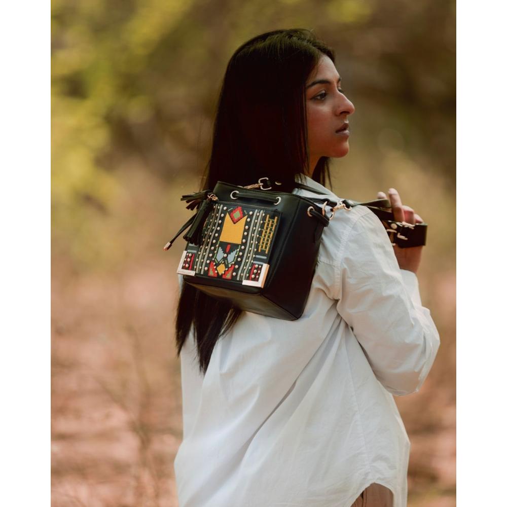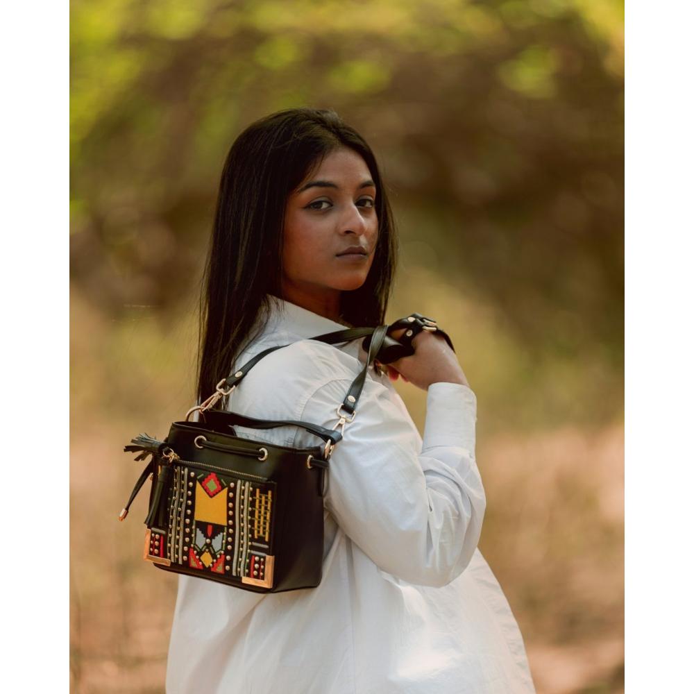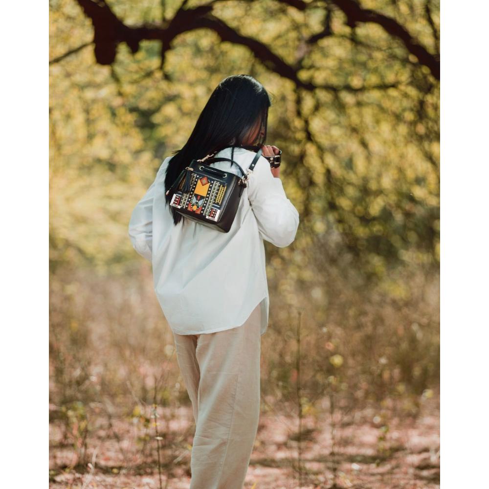 This bohemian, vibrant, tribal vegan leather sling bag embodies bohemian, vibrant, tribal and vegan leather craftsmanship. Ideal for collectors of unique accessories, it offers a statement of style and function. Packed & quality-checked by Indianshelf.