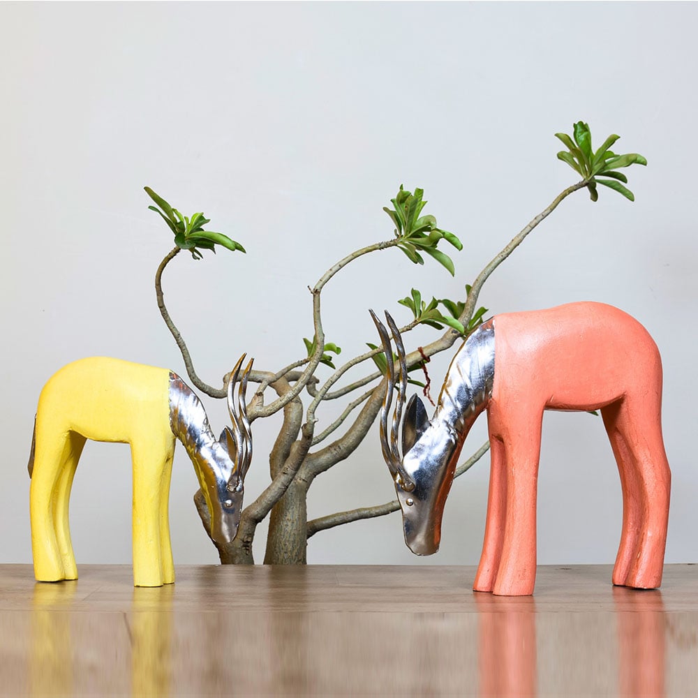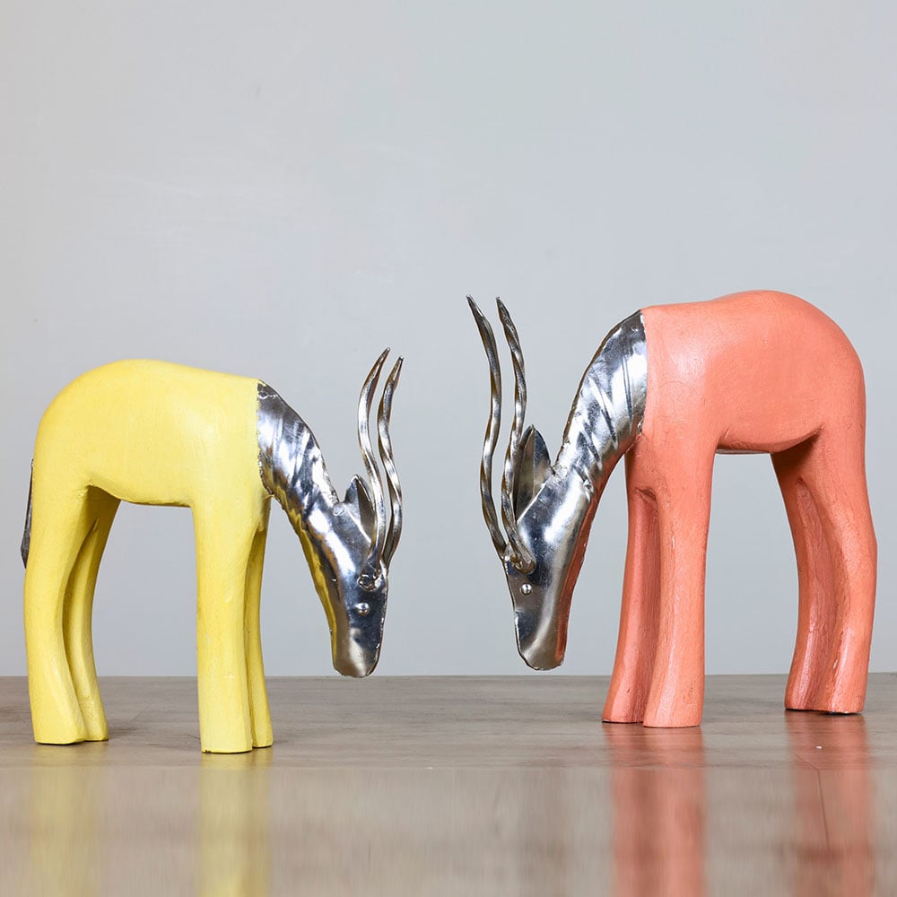 Hand-carved antelope sculptures evoke boho African art with sleek wooden bodies and metallic faces and horns. Painted in pastel sunshine yellow and coral peach, the pair brings warmth and sophistication to interior styling, perfect for collectors, gift-givers, or those seeking distinctive conversation pieces. Their unique form adds cultural flair. Packed & quality-checked by Indianshelf.