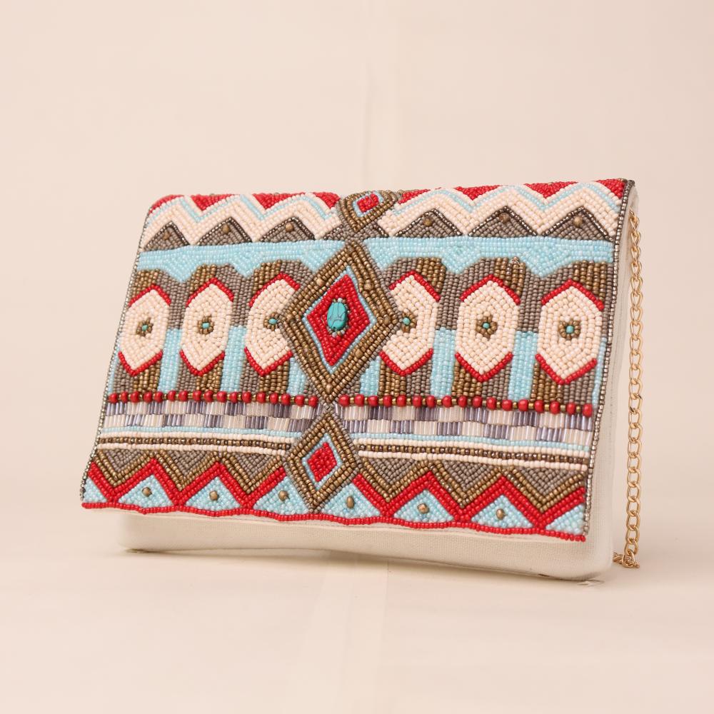 Infused with tribal charm and intricate craftsmanship, this clutch makes a bold style statement with its vibrant beaded patterns and geometric accents. Perfect for adding a splash of artistry to any outfit, it’s a celebration of traditional design with a modern silhouette. Comes with a detachable chain strap for effortless shoulder or crossbody carry, making it as practical as it is stylish.