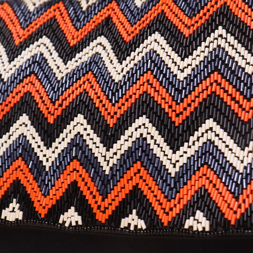 Make a bold style statement with this handcrafted zigzag-patterned clutch, a blend of tribal flair and modern elegance. Its striking chevron beadwork is complemented by clean lines and a soft finish, offering a perfect mix of texture and pattern. Whether worn as a sling with its sleek chain strap or carried as a clutch, this accessory effortlessly elevates any ensemble.