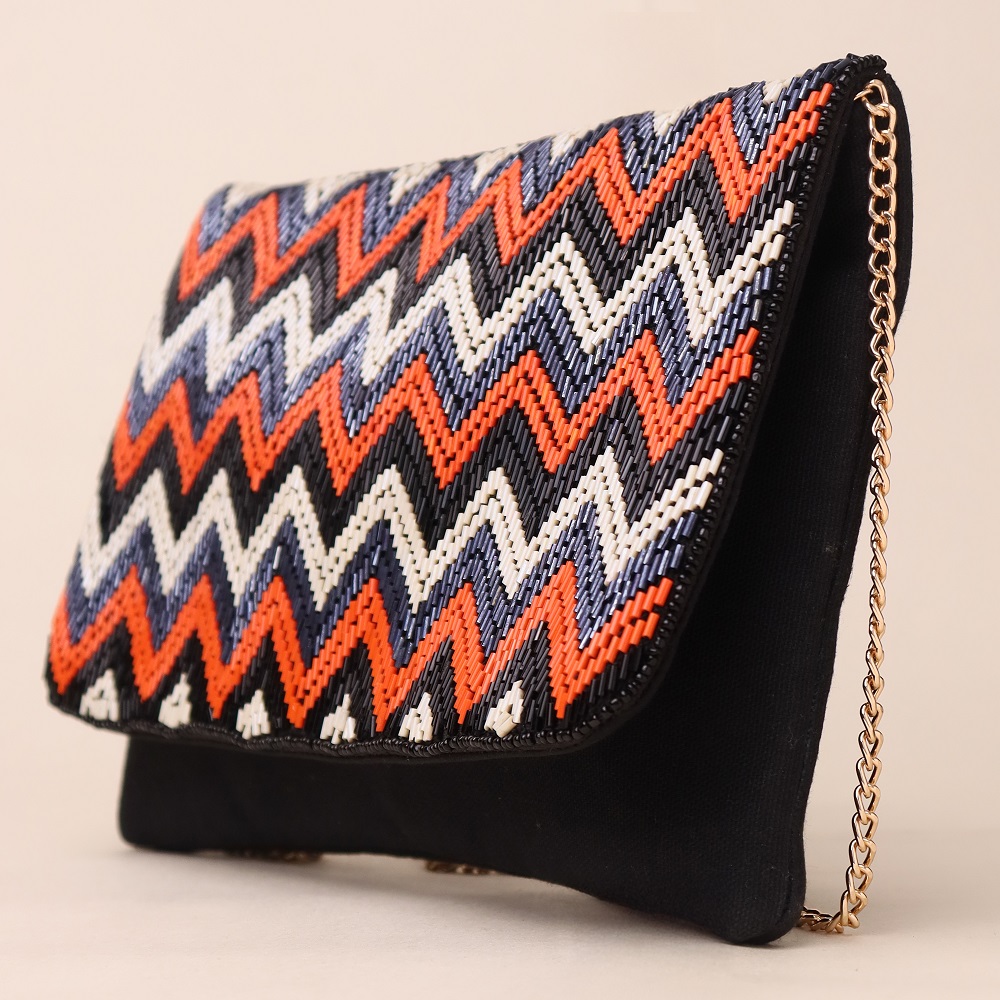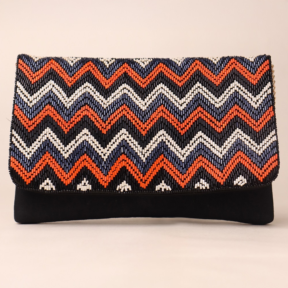Boho Zigzag Hand-Beaded Clutch with Detachable Chain Strap