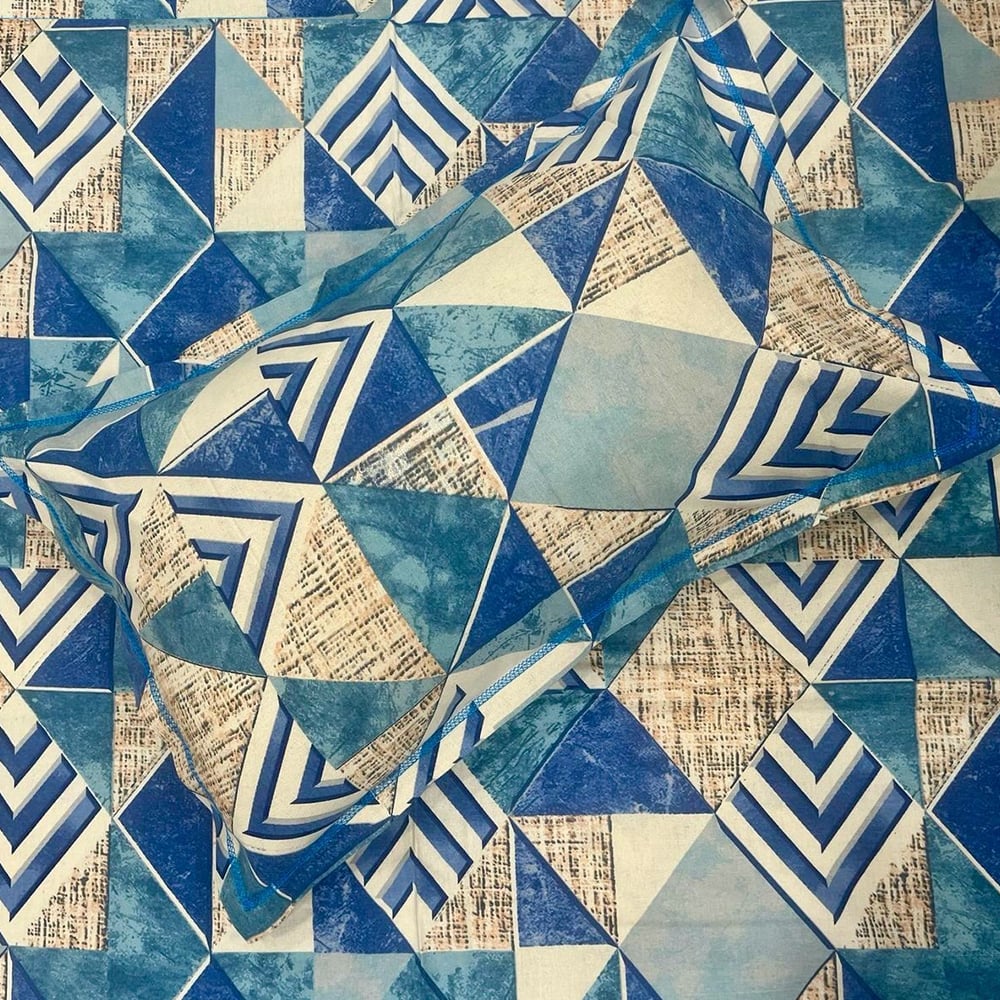Add a modern and energetic vibe to your bedroom with this Bold Blue Geometric King Size Bedsheet Set. Designed with a sharp mosaic of triangles, lines, and textured blocks in varying shades of blue, white, and beige, this contemporary print brings movement and depth to your décor. Crafted from 100% pure cotton casement, it ensures all-night comfort with a smooth and breathable finish.This 3-piece set includes one flat (non-fitted) bedsheet and two matching pillow covers that offer a cohesive, modern look — perfect for urban homes or gifting with a bold edge.