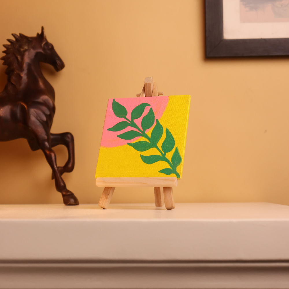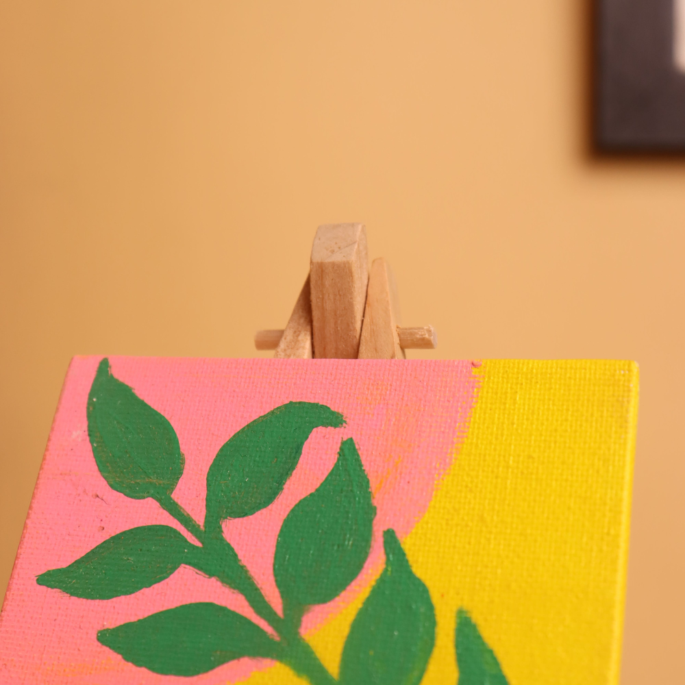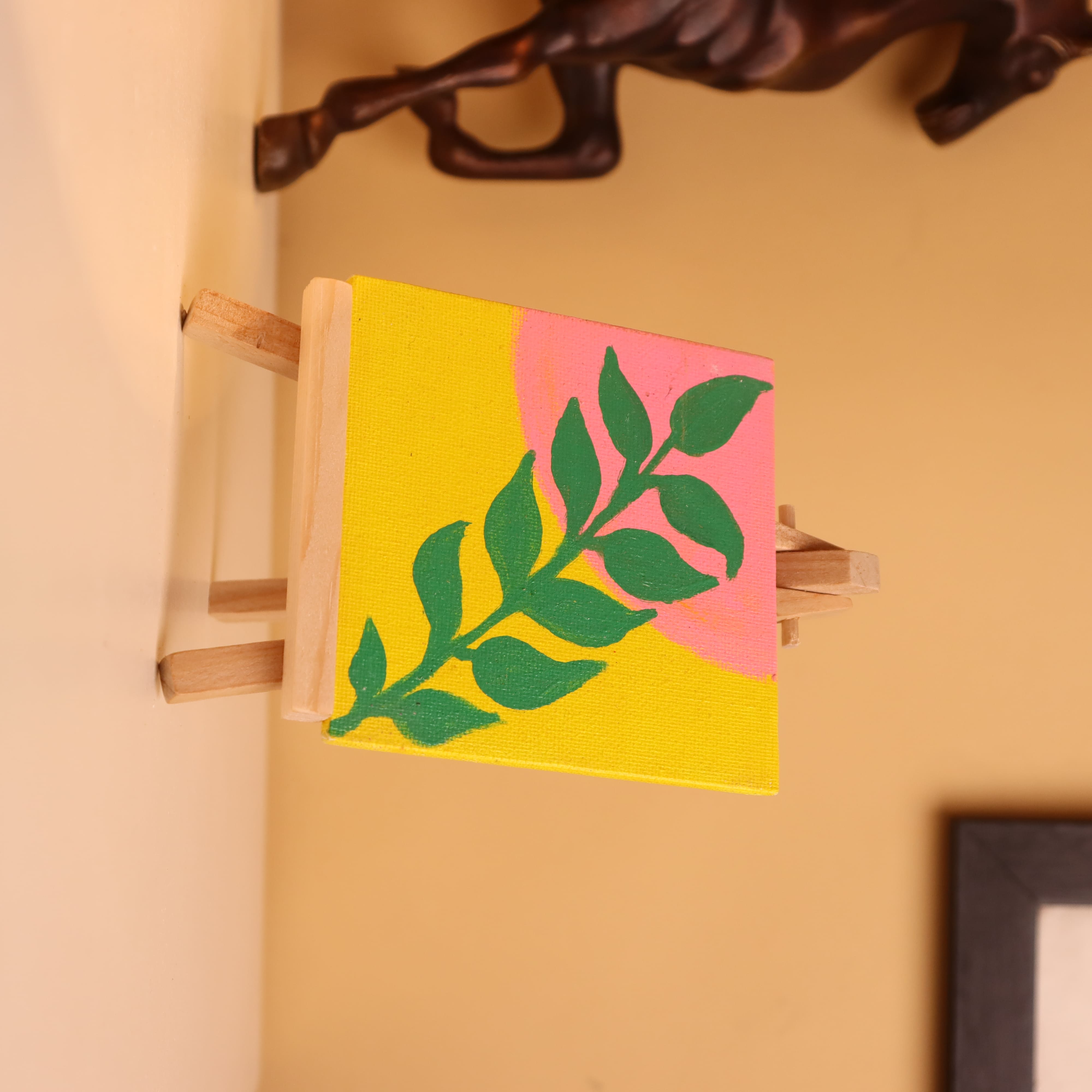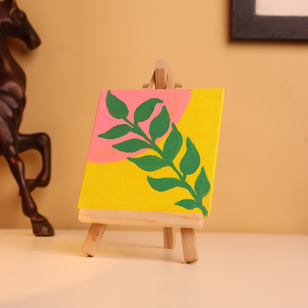 Brighten up your decor with this vibrant 4x4 inch mini canvas painting, featuring a striking green leafy branch set against a bold yellow and pink abstract background. Made using textured paint, the artwork showcases a raised design that adds both visual and tactile interest, creating a dynamic contrast between the smooth color blocks and the leafy silhouette. The fresh green of the leaves pops beautifully against the rich, sunlit yellow and soft pink hues, evoking feelings of warmth, growth, and positivity. Perfect for small spaces, work desks, or gallery walls, this compact botanical piece adds modern flair with a natural touch. Ideal for plant lovers, color enthusiasts, or anyone who appreciates minimal yet eye-catching art. Each canvas comes with a wooden easel stand, making it a ready-to-display gift for birthdays, housewarmings, or festive decor. Hand-painted with love, this miniature artwork blends nature and abstract art in perfect harmony.