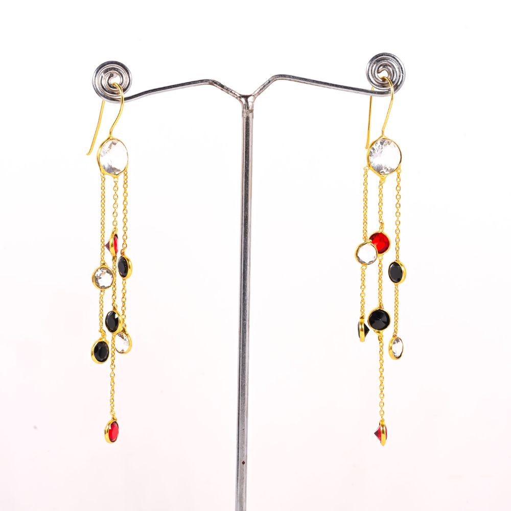 Grace meets brilliance in these 22k gold plated chain dangle earrings, meticulously crafted from solid brass. Each strand features colorful CZ stones that catch and reflect light with every step, creating a mesmerizing play of sparkle. Their elongated design offers a striking silhouette, making them perfect for women who love bold yet graceful jewelry. Designed by artisans, these earrings blend contemporary glamour with timeless craftsmanship.