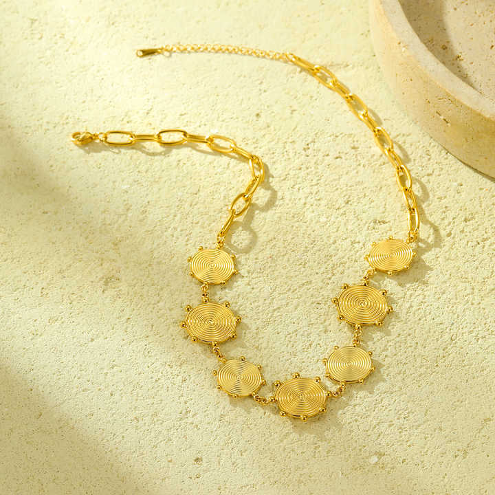This 22K Gold-Plated Brass Choker Necklace blends contemporary simplicity with the warm radiance of traditional metalcraft. Designed as a sleek 16-inch choker, it features a polished round charm that sits gracefully at the center—creating a refined, minimalist look perfect for modern women. Crafted from solid brass and coated in rich 22K gold plating, the necklace offers a luminous golden glow with the craftsmanship of a handmade piece. Its clean lines and elegant finish make it a versatile accessory suitable for both everyday and elevated styling.
