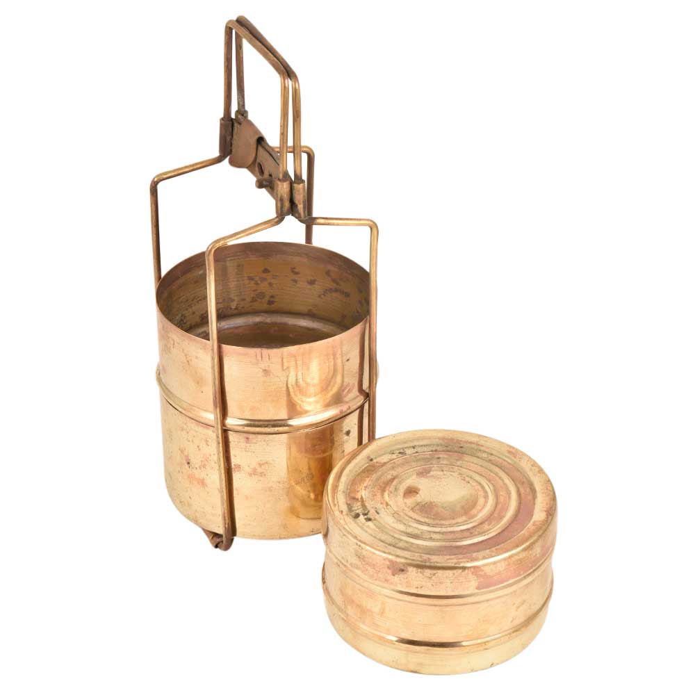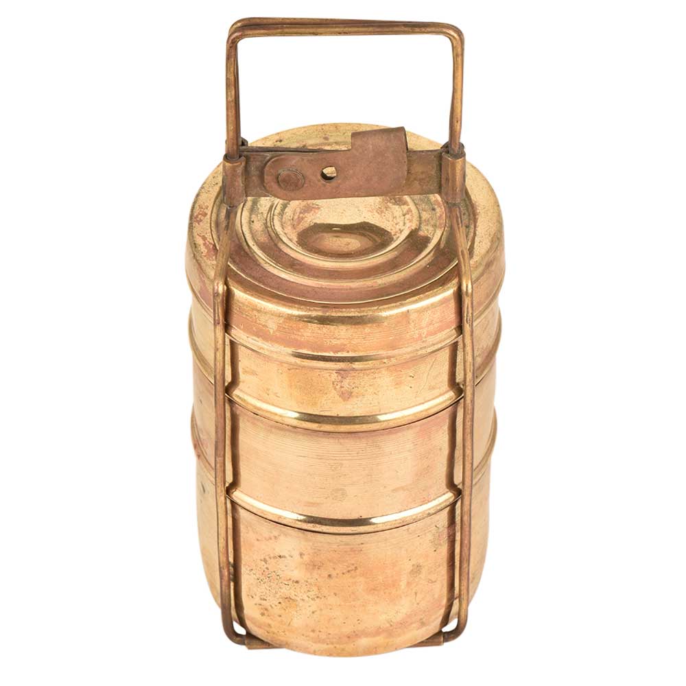 The brass three compartments Tiffin box is a very popular Indian household item. The lunch box is made of very high quality brass it comes with three storage boxes that are stacked one above the other and secured with the help of a clasp. Now used as a table ornament, jewelry storage and for presentation of food.