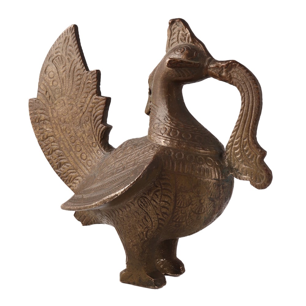Tamil Nadu is the home of this exquisite and intricate statue of Annapakshi that is perched atop a tiny wooden block. A mysterious white bird known as Annapakshi, it has the body and beak of a swan and the stunning plumage of a peacock. It's thought to live in heaven. The bird is typically shown holding a flowering vine in its beak, which represents abundance. Annapakshi is a symbol of grace and purity as well. It is thought that if a bird is given a mixture of water and milk, it can separate the milk from the water, symbolizing choosing truth over falsehood. In addition, it is a very common motif throughout all of South India, appearing on textiles, objects, diyas, and more. This brass Annapakshi will give your home's decor a touch of tradition.