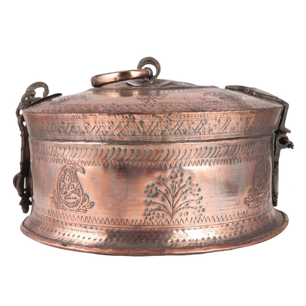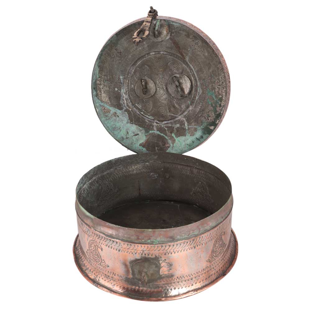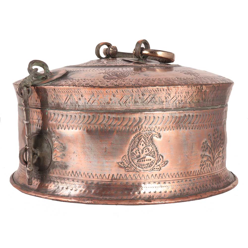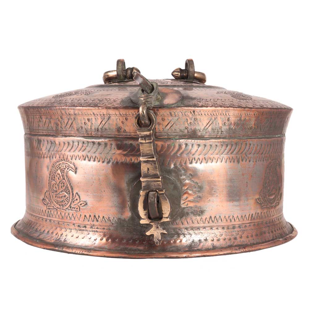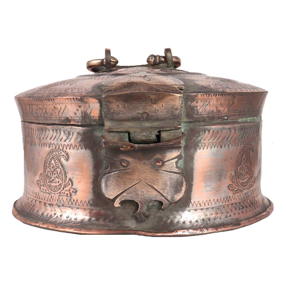 This is indeed a truly lovely piece of old Indian workmanship - a sturdily made domed lid box, most likely originally for spices, paan, or betel. It is made of heavy gauge brass and features a beautiful hand engraved design on the body and lid, as well as an ornate handcrafted handle, chain-hinges, and clasp. The piece is most likely from the nineteenth century. It looks great as a decorative piece and would make an excellent jewellery box.